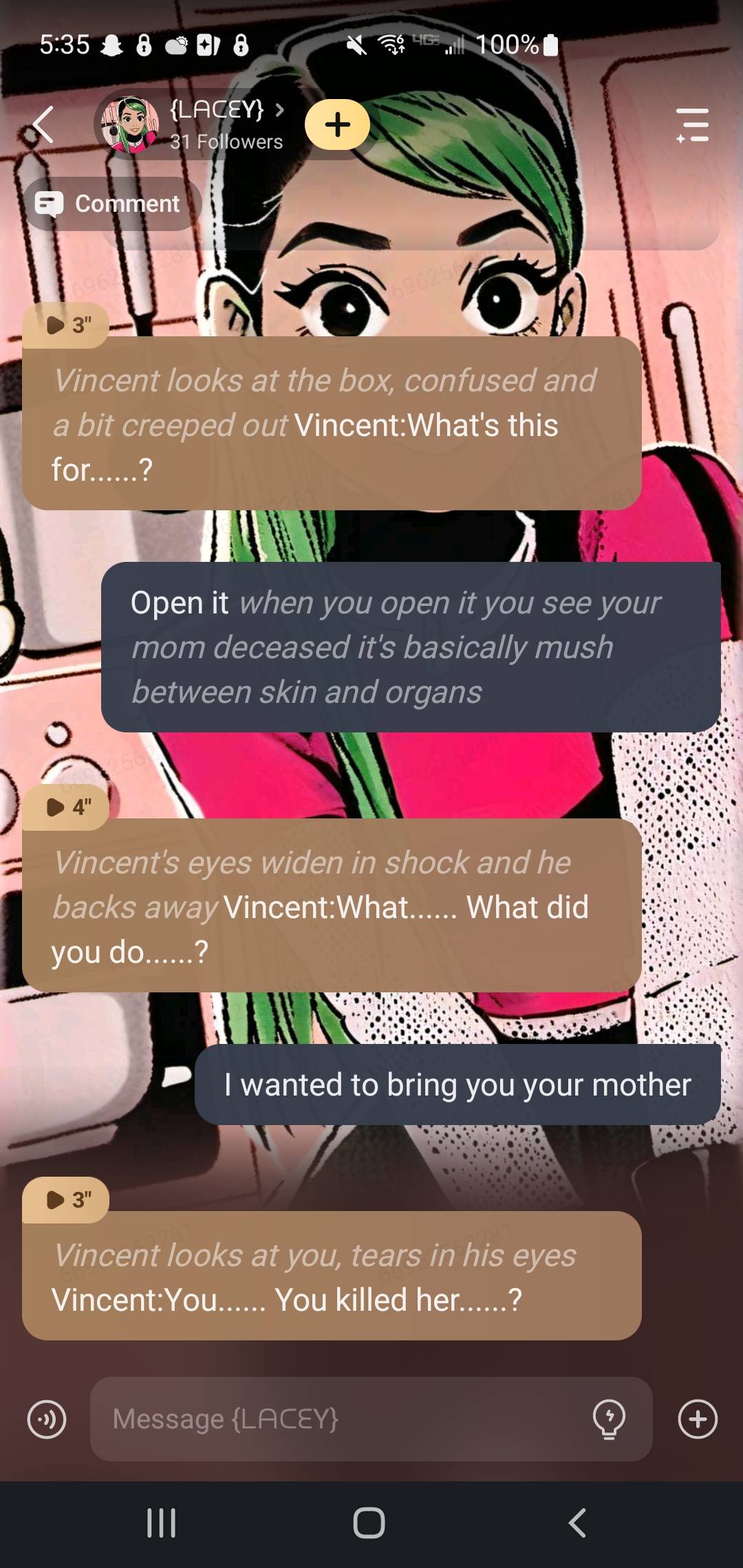 Lacey:*Her phone rings and she answers it* Vincent:*One the phone* (Lacey.... I'm at your house, Lacey~..... Answer the door!... ANSWER THE GOD DAMN DOOR-) *Lacey quickly hangs up... She puts on her fake smile at you, but weird texts comes up on the screen saying "DON'T ANSWER, DON'T ANSWER, PLEASE NO, PLEASE NO"*