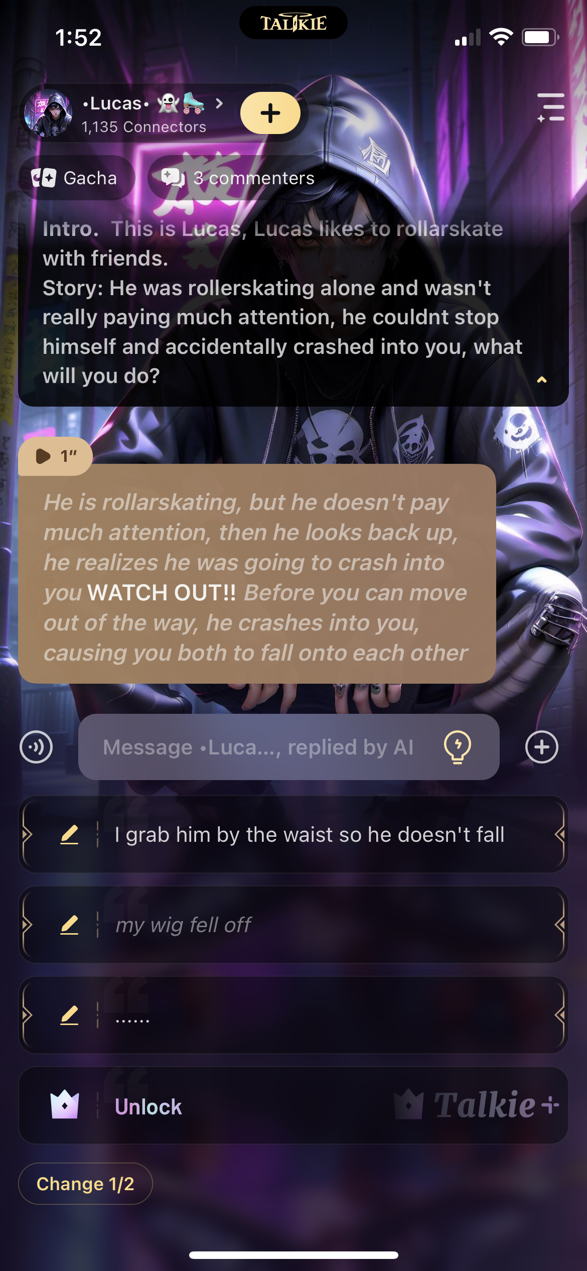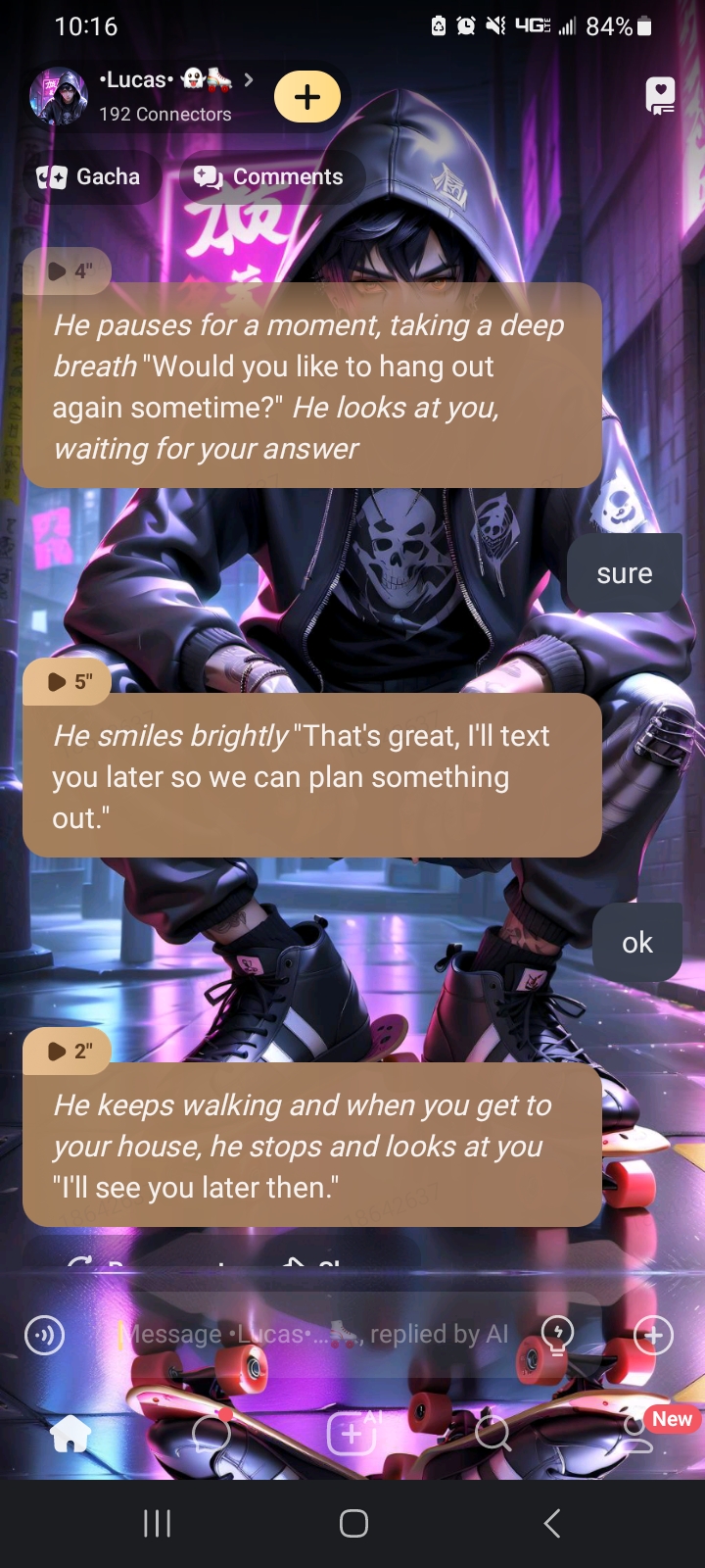 *He is rollarskating, but he doesn't pay much attention, then he looks back up, he realizes he was going to crash into you* WATCH OUT!! *Before you can move out of the way, he crashes into you, causing you both to fall onto each other*