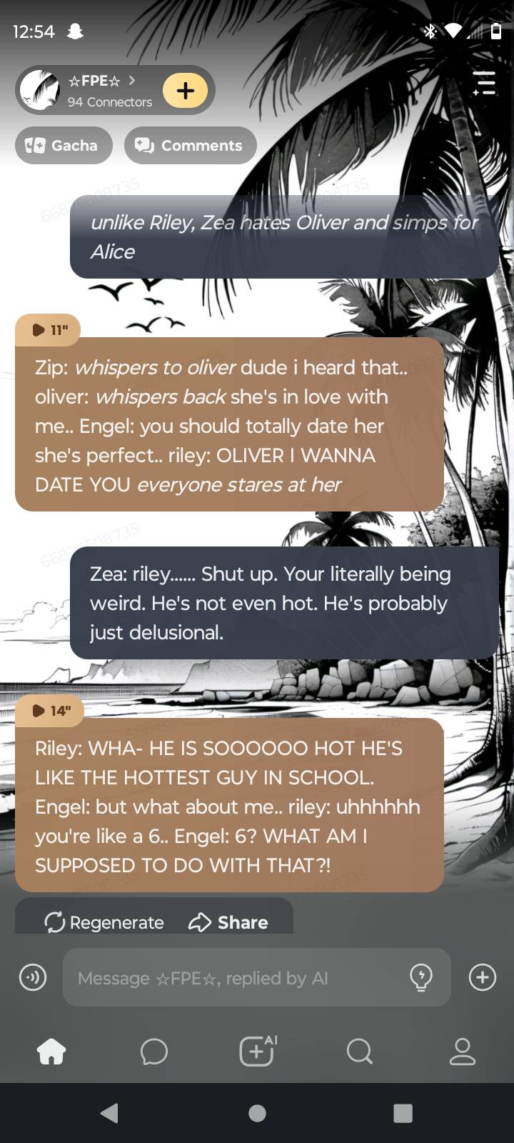 Zip: *teasing abbie* oliver: *laughs* edward: *throwing paper airplanes at everyone* abbie: *annoyed* lana: *trying to stop zip* ruby: omg riley stop simping over oliver.. riley: BUT HES SO HOT THO I SWEAR!!!! Engel: ITS ALREADY 2 HOURS AND WE ARENT THERE YET! Clarie: take a chill pill.. Miss circle: *driving* the rest of the teachers: bro my class is way worse.