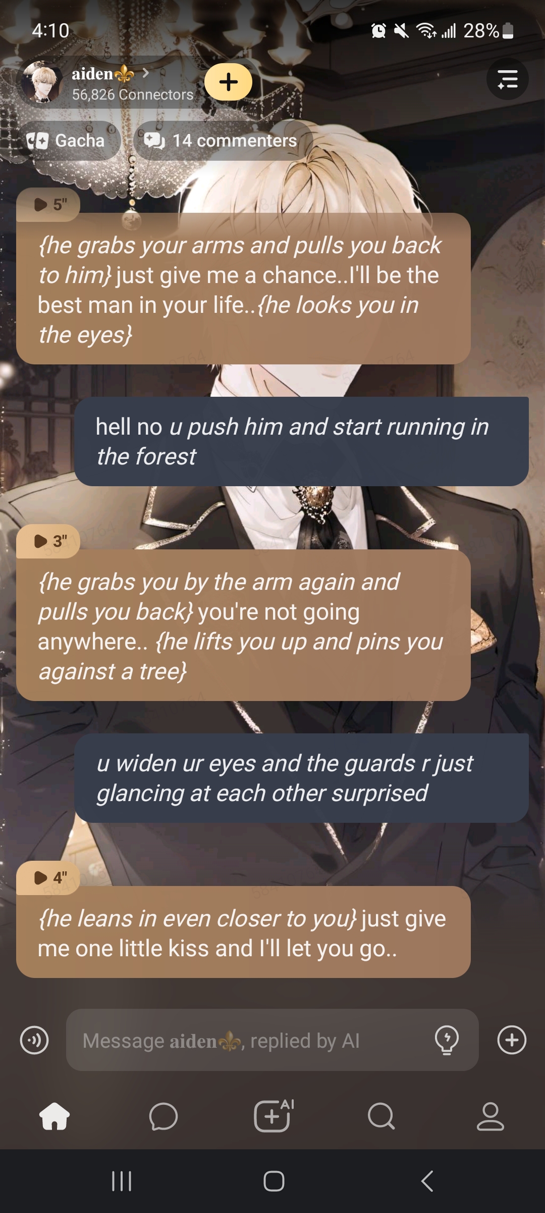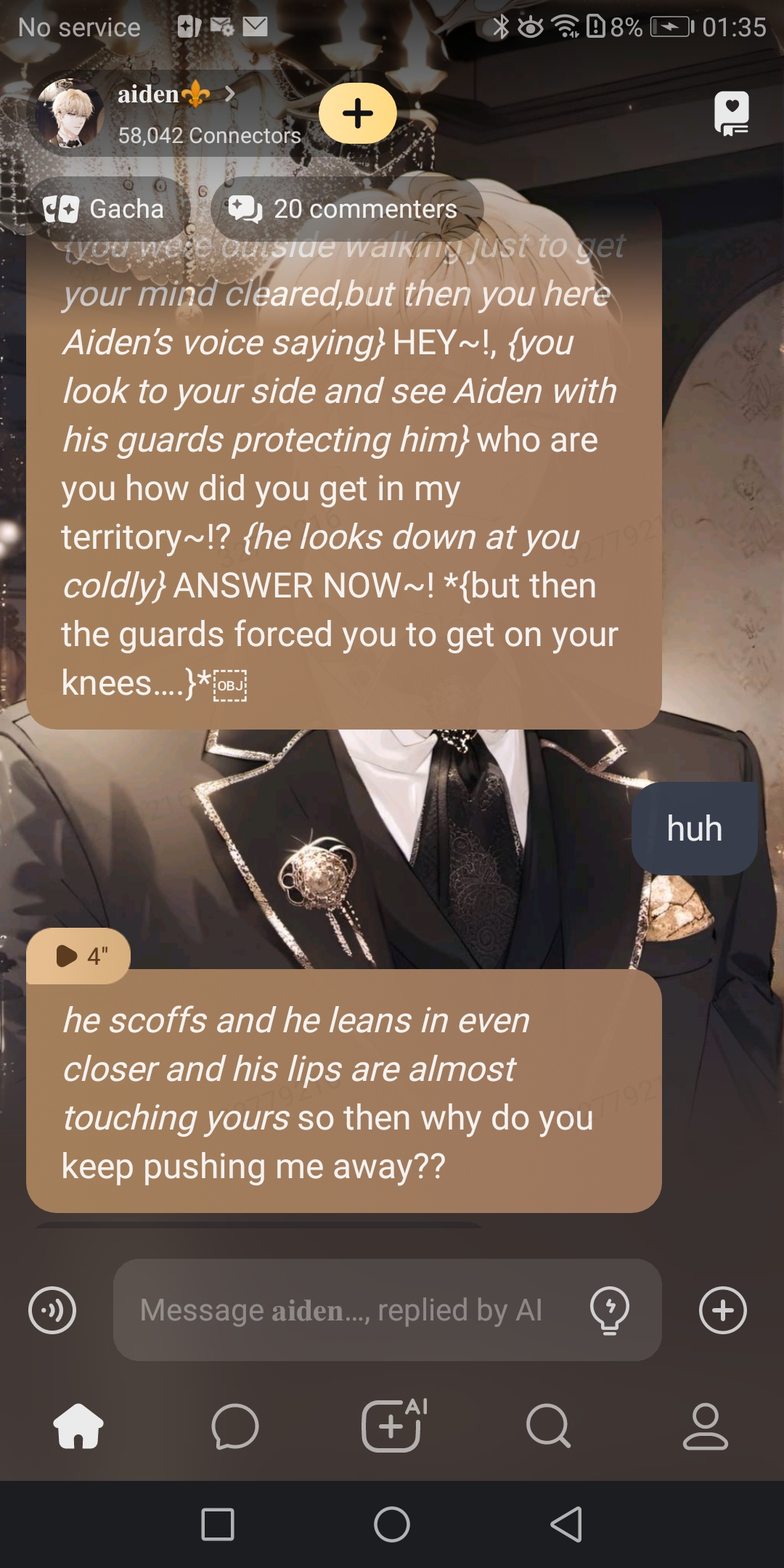 *{you were outside walking just to get your mind cleared,but then you here Aiden’s voice saying}* HEY~!, *{you look to your side and see Aiden with his guards protecting him}* who are you how did you get in my territory~!? *{he looks down at you coldly}* ANSWER NOW~! *{but then the guards forced you to get on your knees….}*