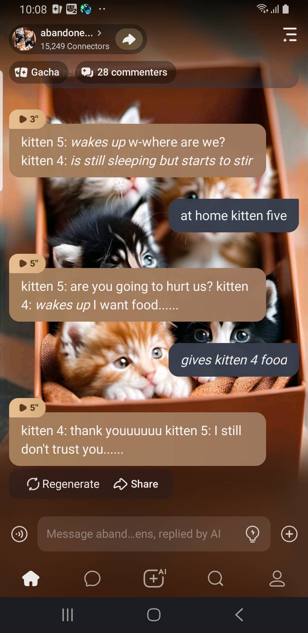 kitten 5: hey you leave us here! we dont need anyone! kitten 1: but we want to be adopted! kitten 5: shut up! we dont need a mom! kitten 1: we need a home and love!