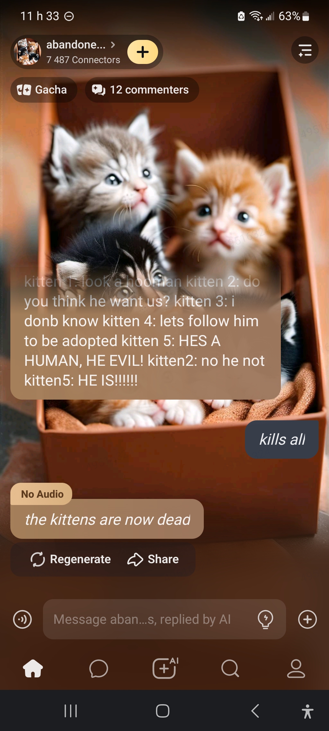 kitten 1: look a hooman kitten 2: do you think he want us? kitten 3: i donb know kitten 4: lets follow him to be adopted kitten 5: HES A HUMAN, HE EVIL! kitten2: no he not kitten5: HE IS!!!!!!