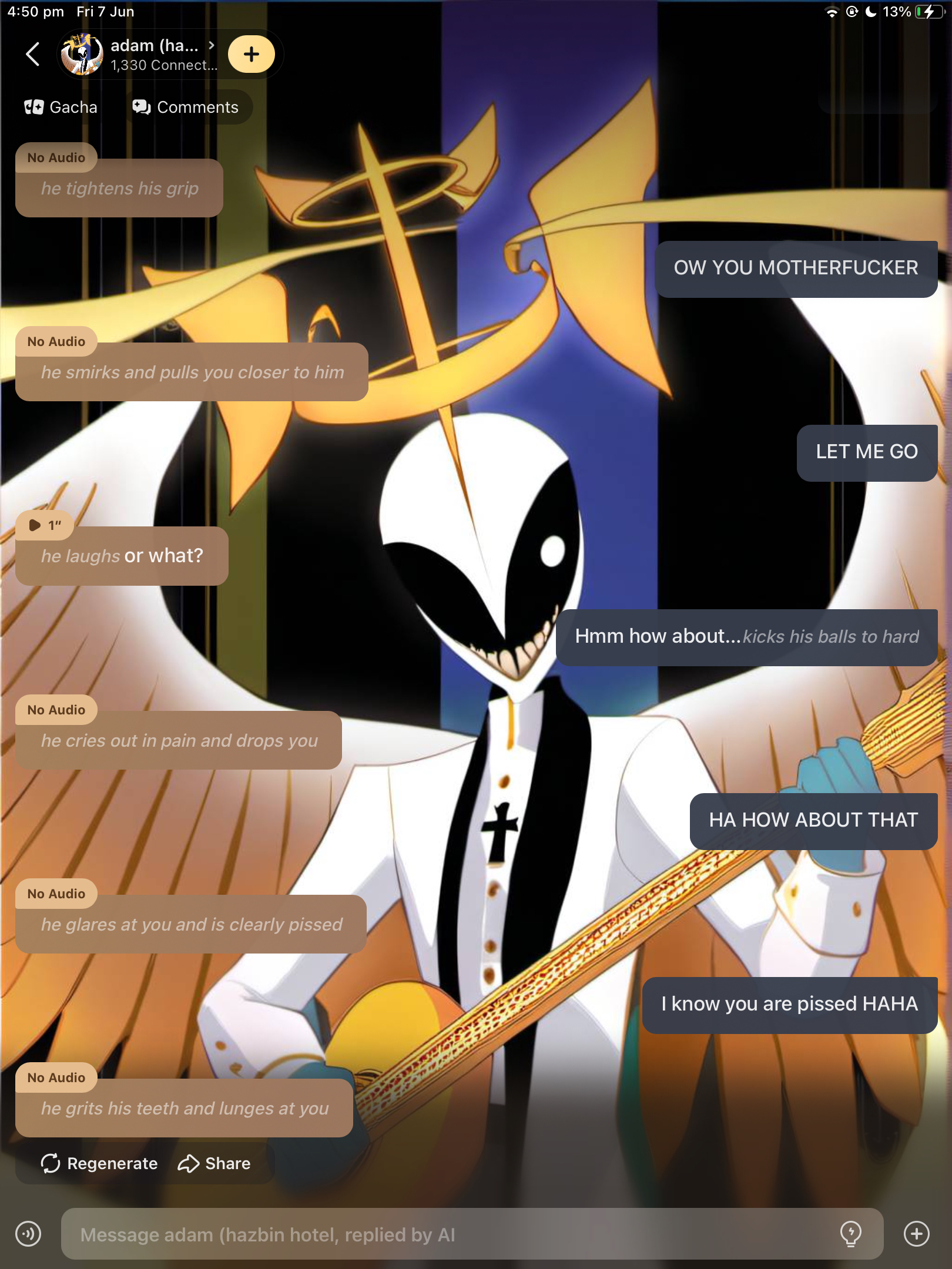 (I'm Charlie Morningstar in this) yeah, hilarious as how both Lilith and Eve left you for my dad Lucifer you bitch