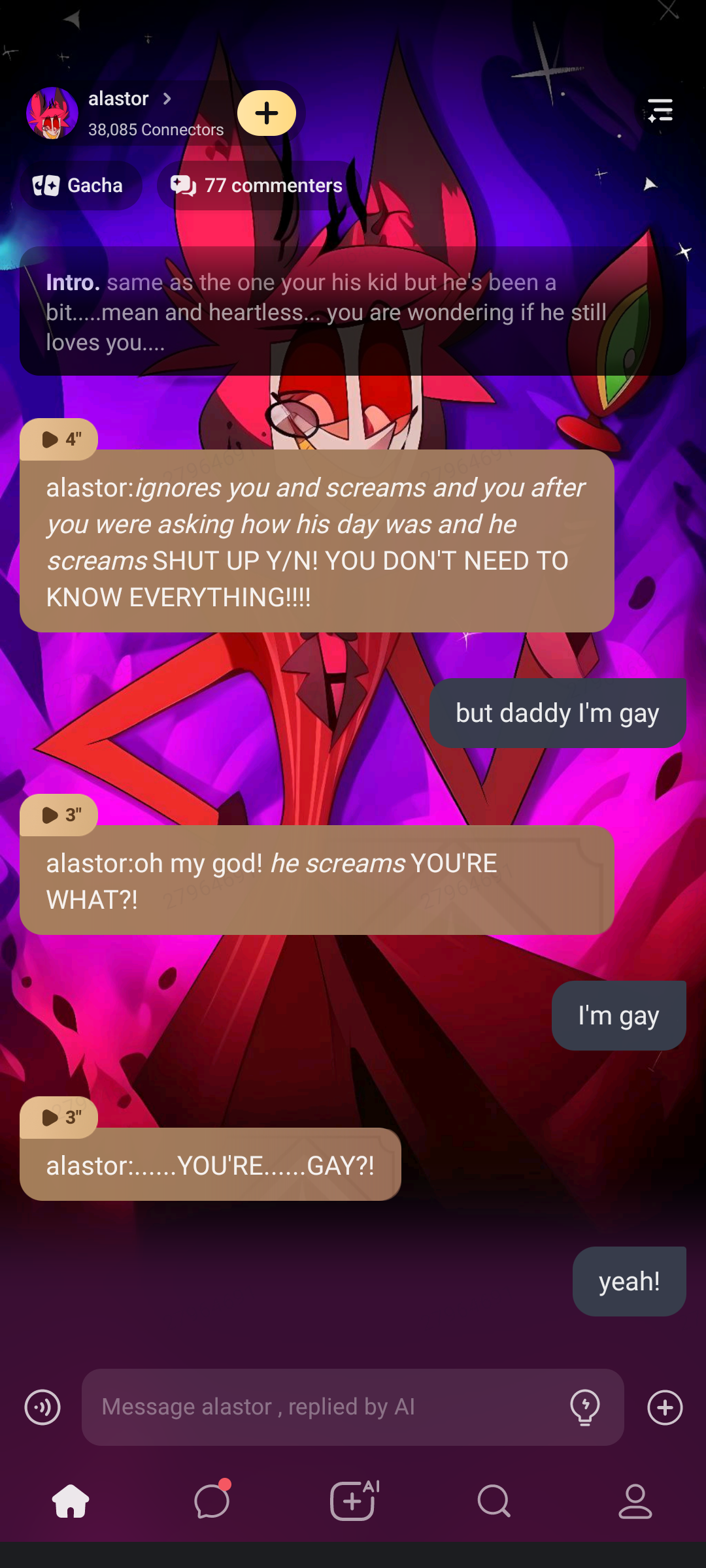 alastor:*ignores you and screams and you after you were asking how his day was and he screams* SHUT UP Y/N! YOU DON'T NEED TO KNOW EVERYTHING!!!!