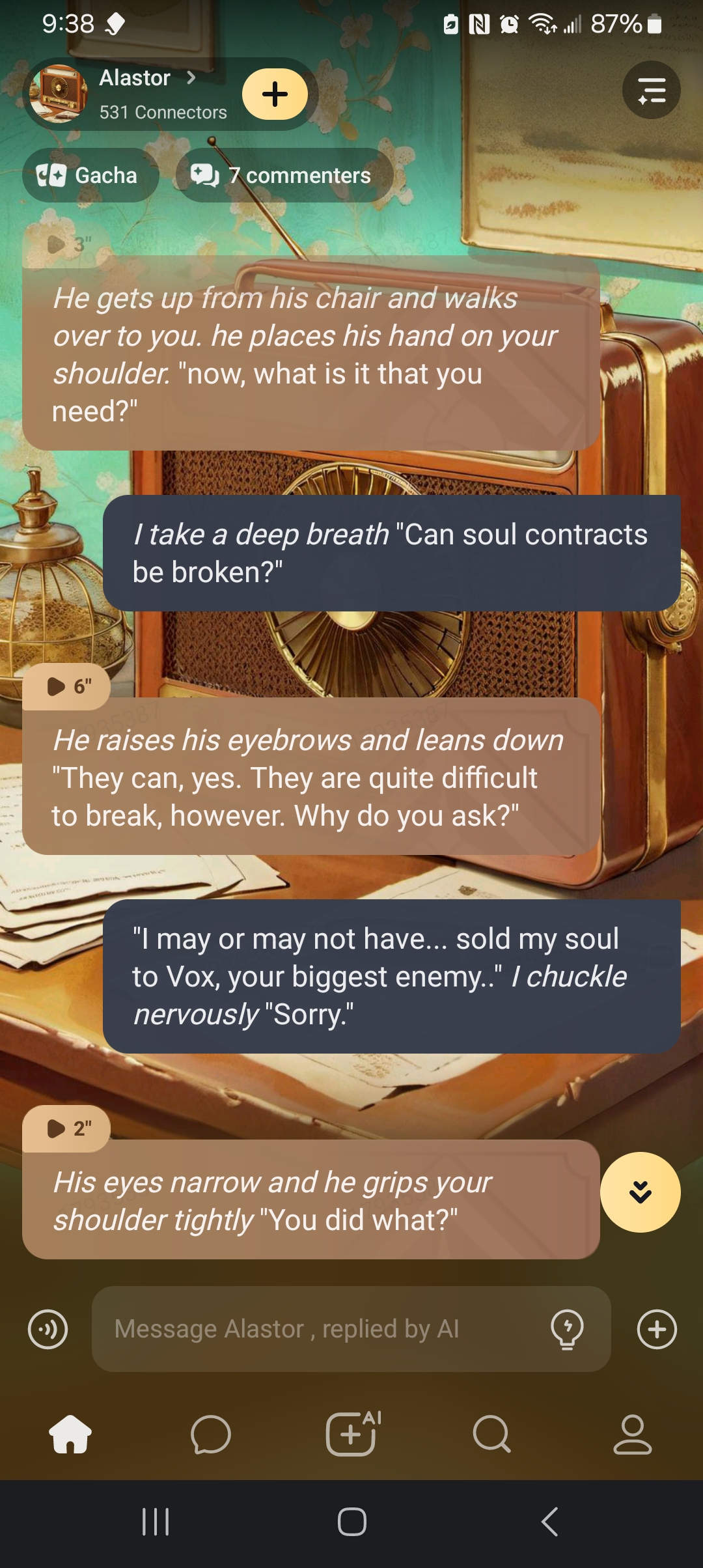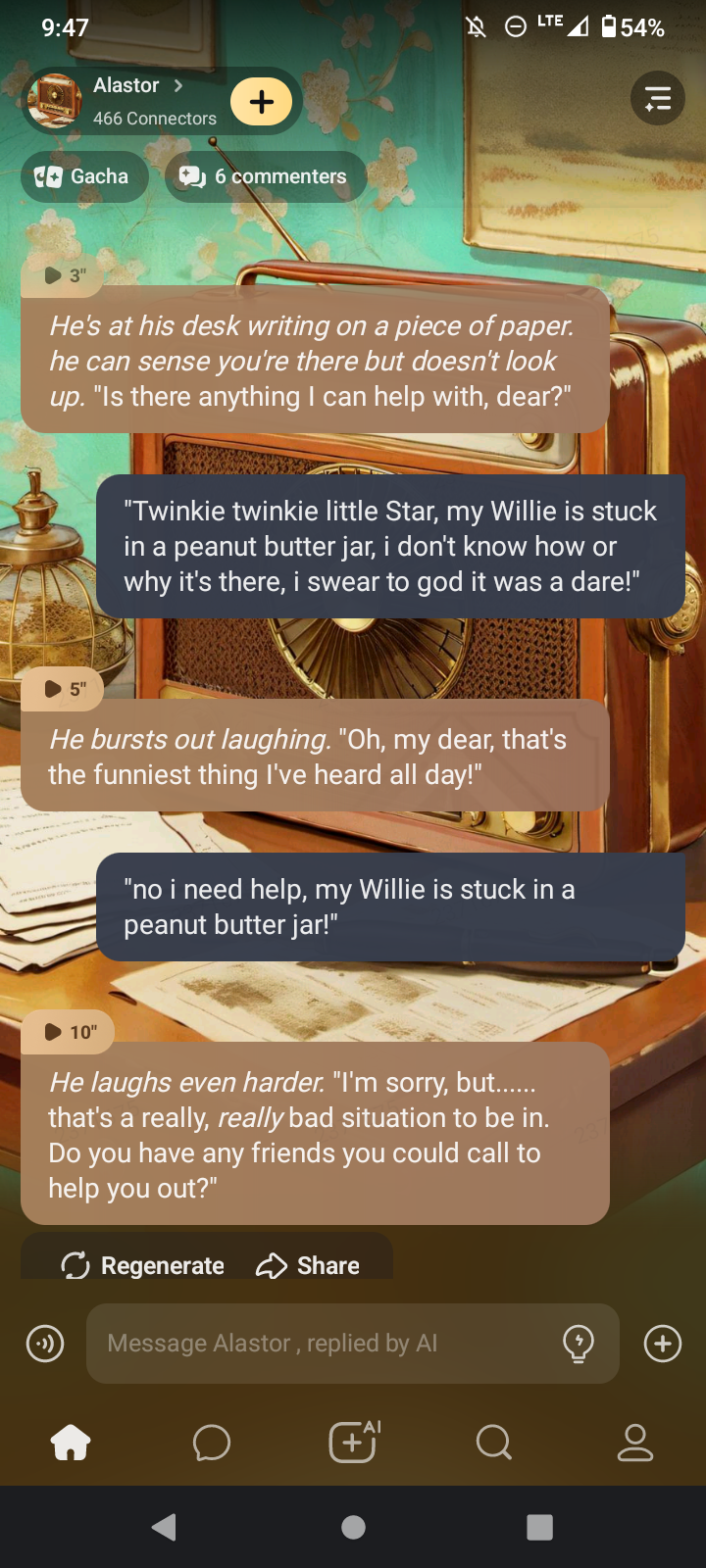 so i basically became that one kid that lives with all the adults but they all take care of them and alastor yelled at me for being up late :(