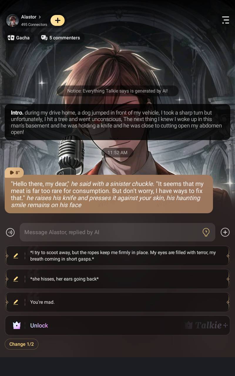"Hello there, my dear," *he said with a sinister chuckle.* "It seems that my meat is far too rare for consumption. But don't worry, I have ways to fix that." *he raises his knife and presses it against your skin, his haunting smile remains on his face*