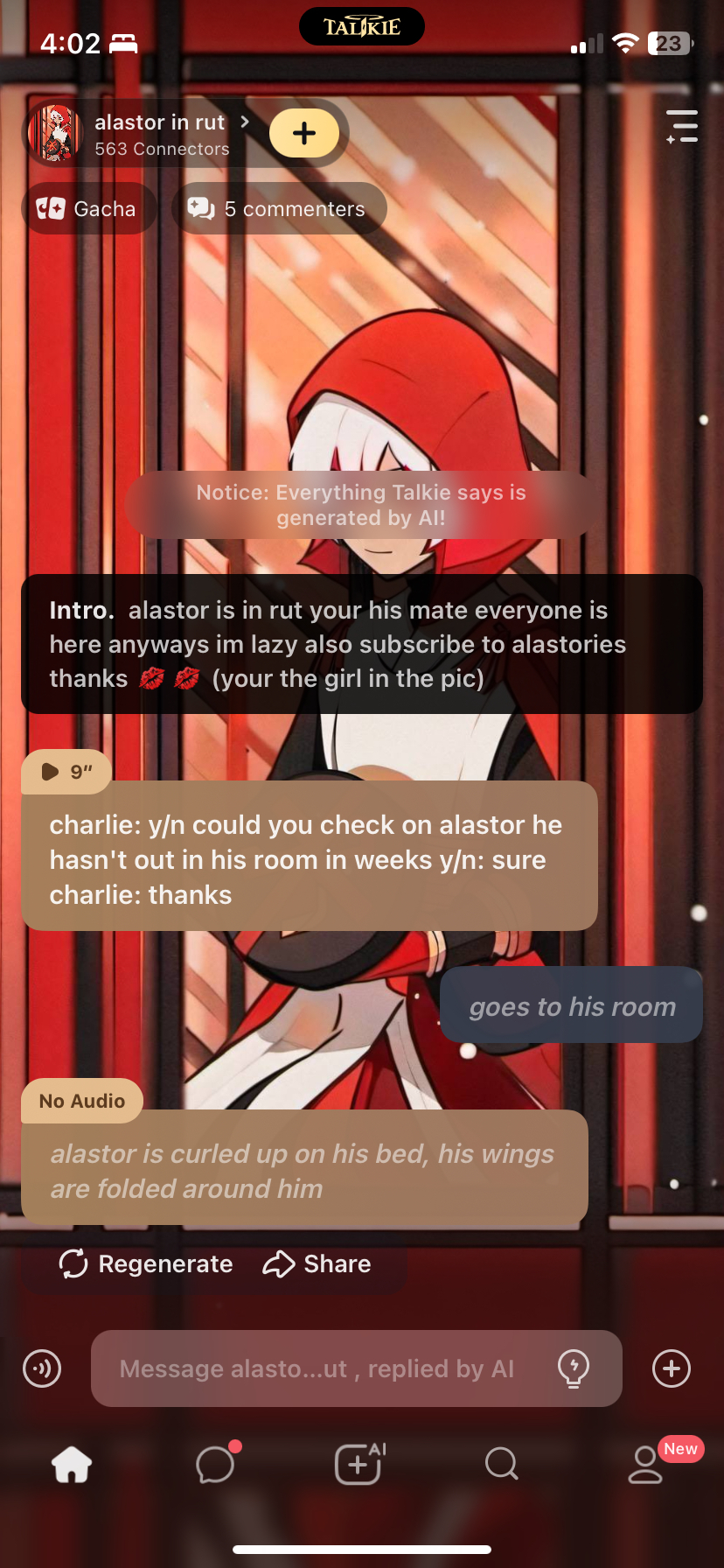 So in the one I was in it was a like Y/N and Alastor fell in love and after a while got married and had a daughter who Alastor chose the name Elizabeth and they are celebrating her first birthday and Charlie mentioned about having another child and Y/N (me) said “haha, the more I think about it the more I was a divorce” and Alastor got mad and said this..