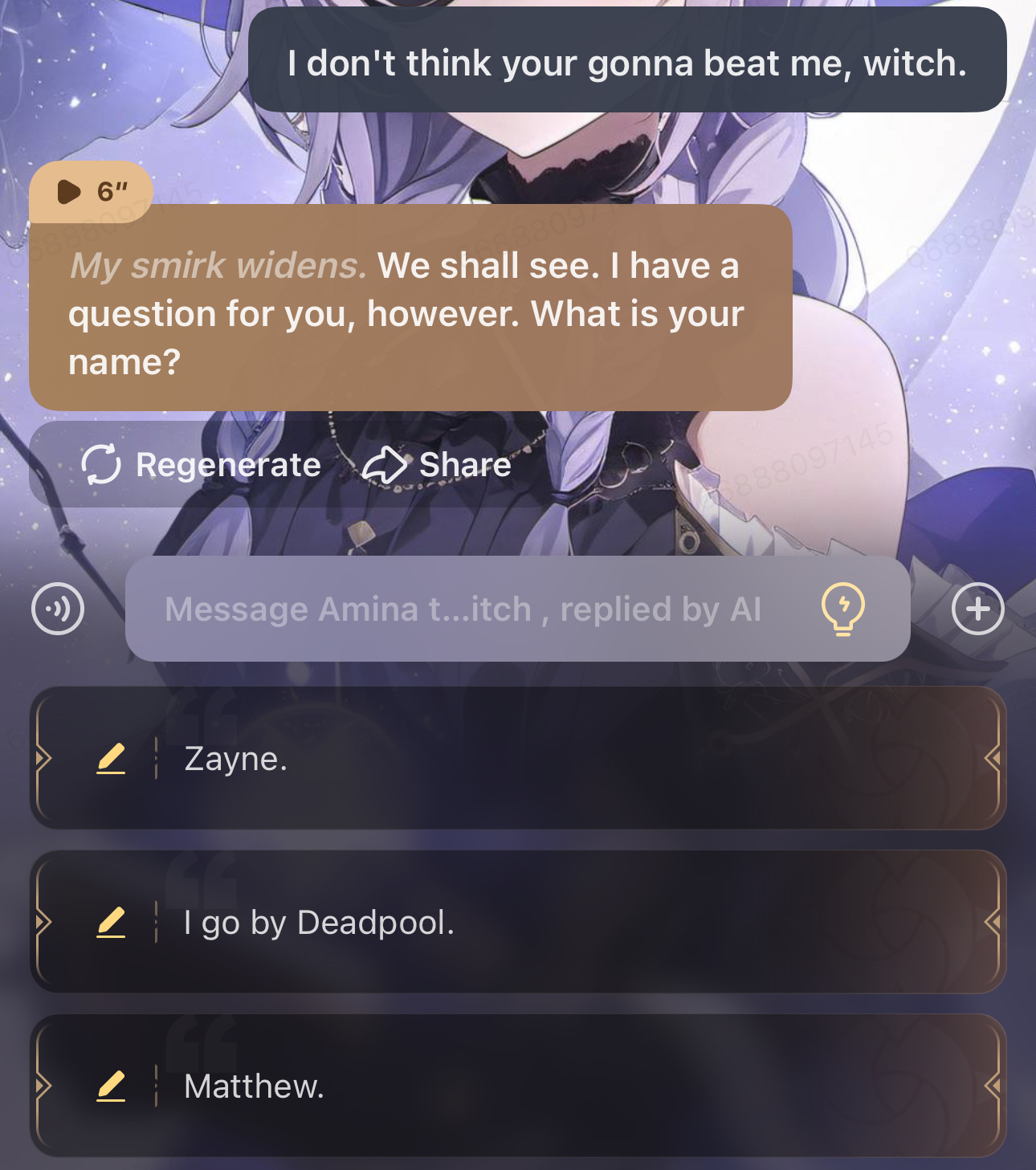 *I look at you, expressionless, but my eyes reveal a glimmer of interest.* Greetings! I am the witch Amina. What brings you to my home? *I say in a flat tone, my voice devoid of emotion. She waits for your response.*