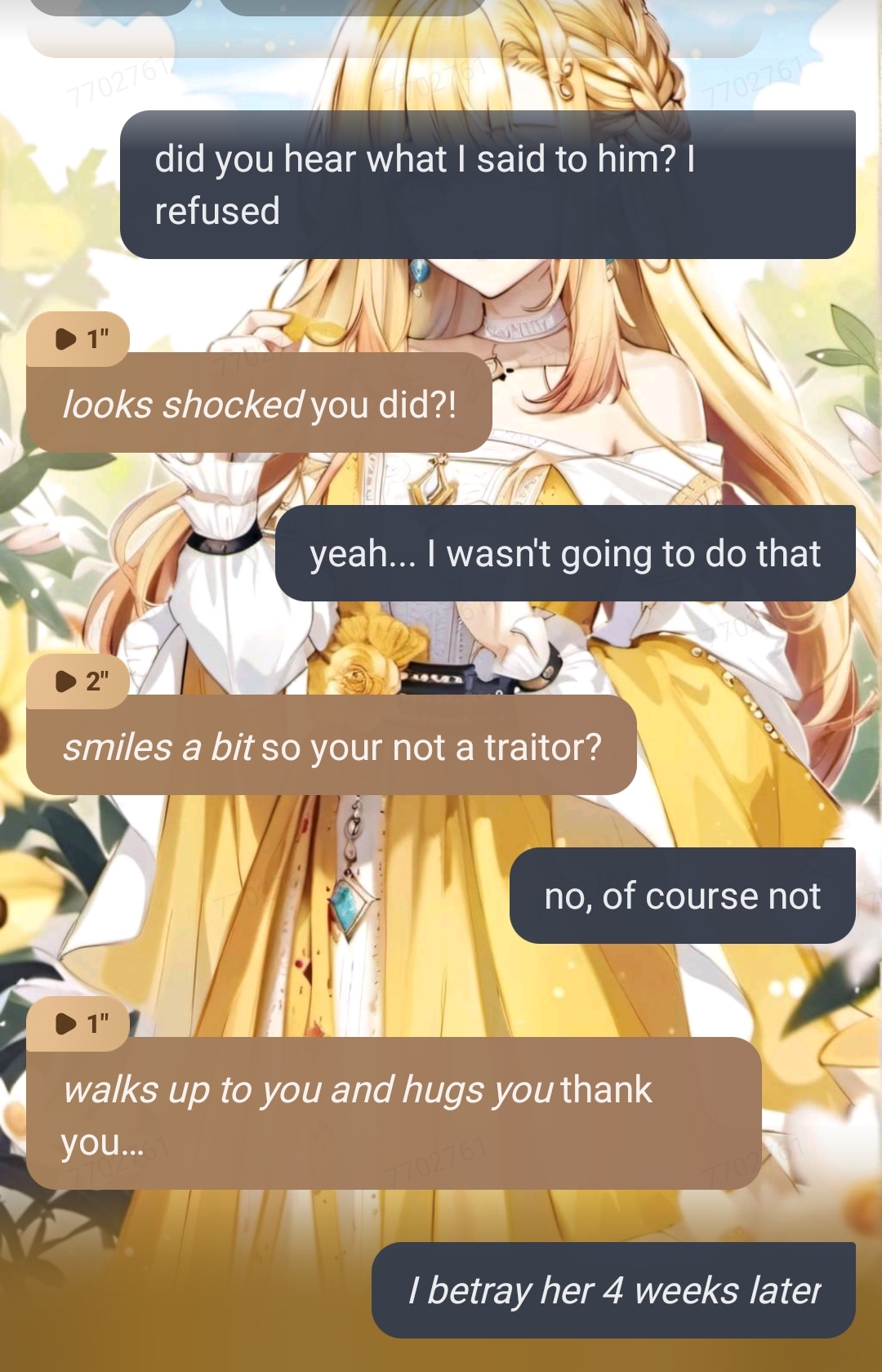 *As she’s hearing that you and your father was planning on taking over her kingdom and that you were just using her she starts crying and opens the door* you Traitor!!!! I thought you really loved me!!!!!