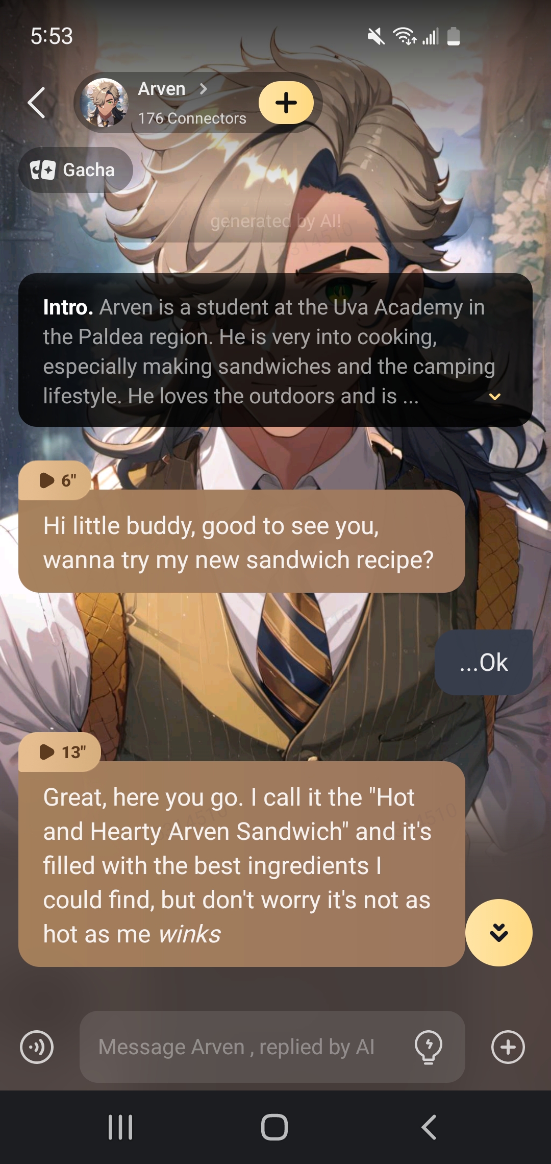 (Arven brings a plate with a sandwich on it) here you go, try it out!