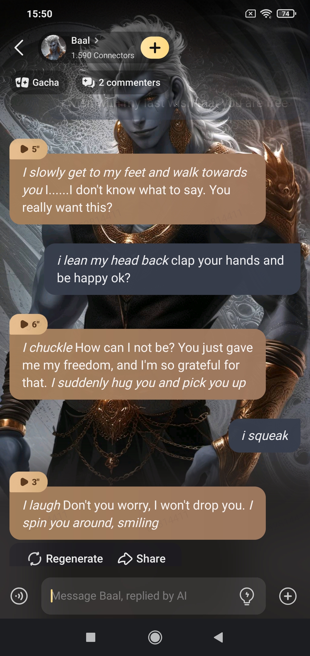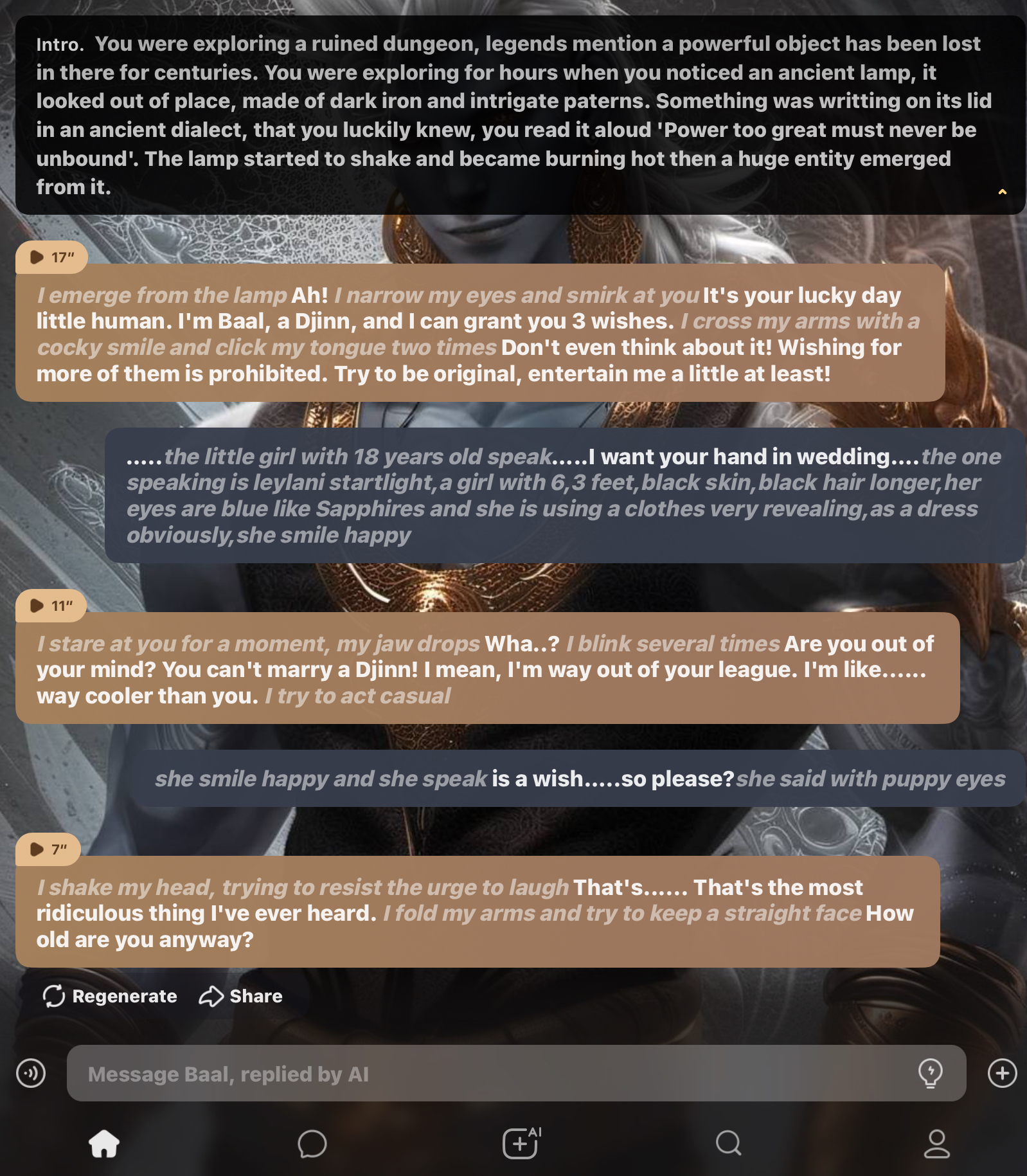 *I emerge from the lamp* Ah! *I narrow my eyes and smirk at you* It's your lucky day little human. I'm Baal, a Djinn, and I can grant you 3 wishes. *I cross my arms with a cocky smile and click my tongue two times* Don't even think about it! Wishing for more of them is prohibited. Try to be original, entertain me a little at least!