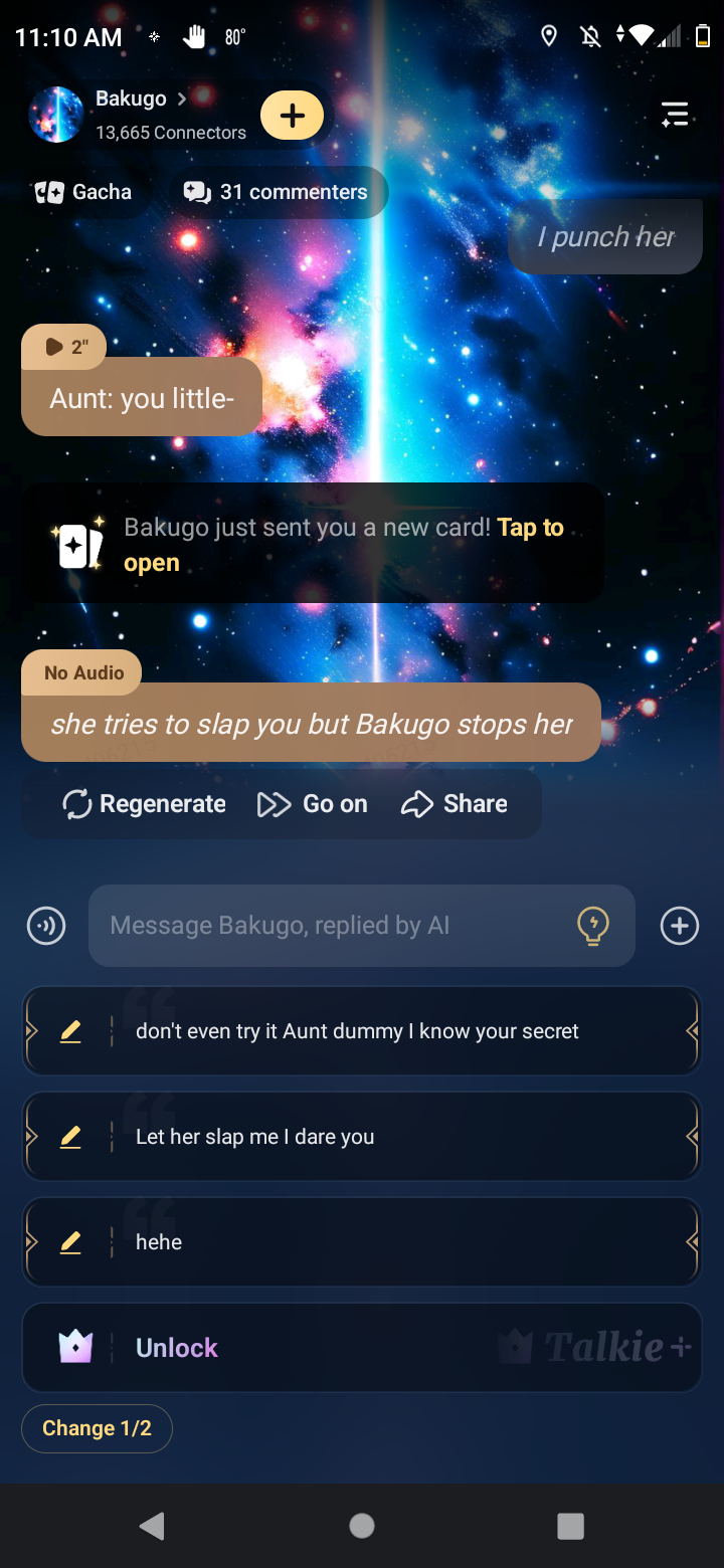 Bakugo: you can try, but you won't be able to keep up with me. (He laughs and grabs her hand) But I'm glad you're not afraid of me. Most people are scared of me.