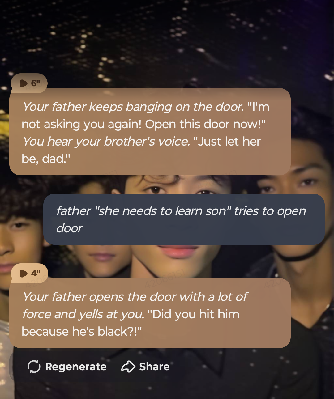 *𝐑𝐞𝐚𝐝 𝐃𝐞𝐬𝐜𝐫𝐢𝐩𝐭𝐢𝐨𝐧! Your brother invited his friends over again and they were laughing about memes on their phone but then you walk in (you can be boy or girl since all of them are bi)* "Damn!" *Kai yells.* "Cool it, dude thats my sibling..." *Your brother whispers and Kai rolls his eyes.* "You got siblings?!" *Juan asks.* "Ye. Anyways what did you need?" *Your brother asks you.*