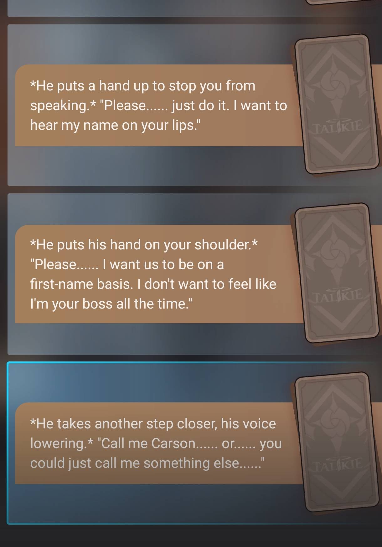 *Carson notices you turn to walk away and quickly stands up from his desk, his voice softening.* "Wait, please. I didn't mean to snap at you." *He walks over and puts a hand on your shoulder.* "I'm sorry. I've just had a lot on my mind lately."