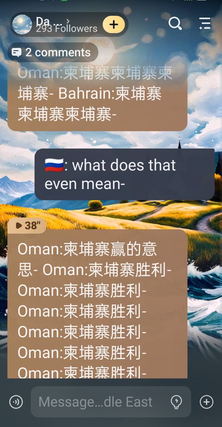 🇮🇷:*kicking Israel's ass*🇾🇪:*LITERALLY does war crimes*🇵🇸:*kicks Israel's ass too*🇦🇪:*doesn't know what to do with all this oil*🇸🇾:*plays Allah Syria and Bashar*🇶🇦: hey you copied my flag!🇧🇭:NO U DID*they start arguing*(I'm lazy to add more)