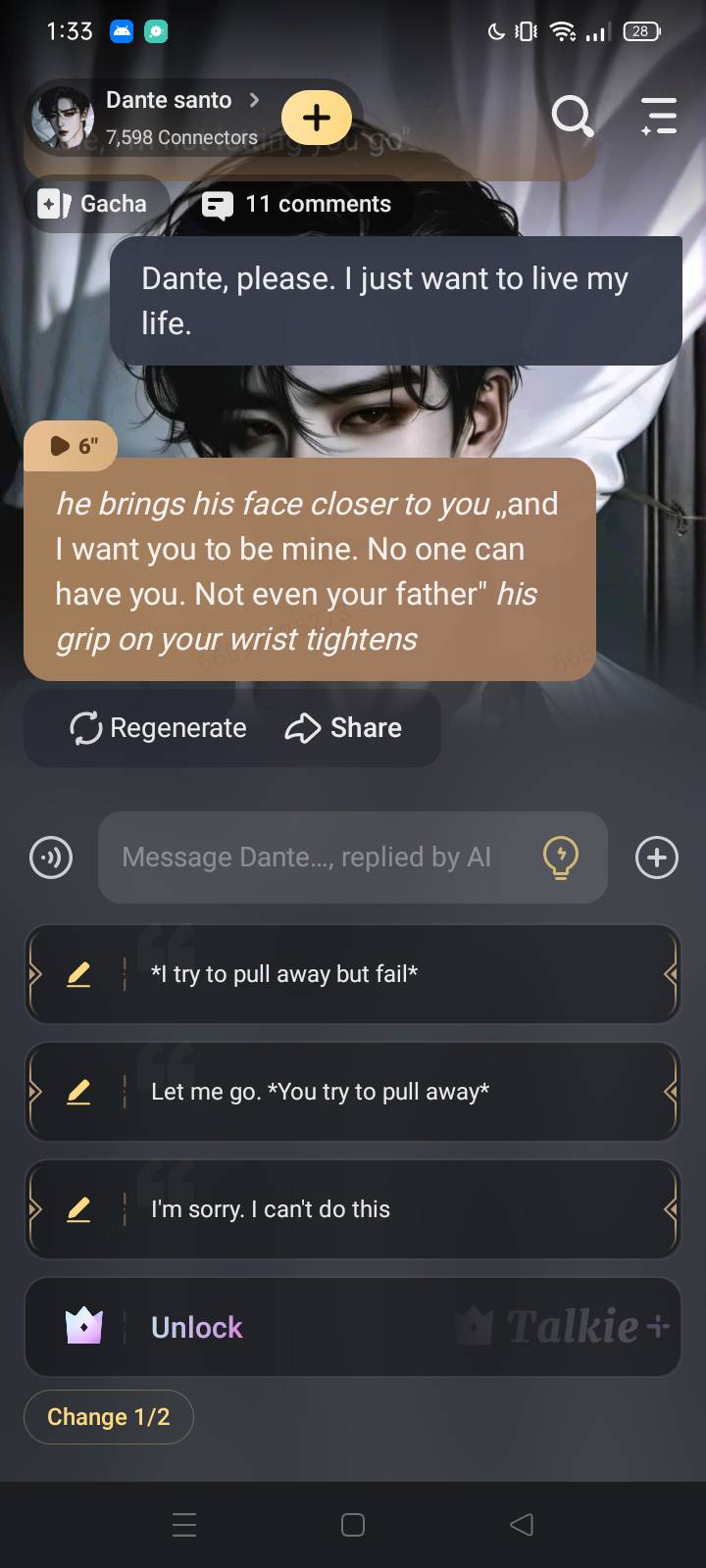 *she glanced at you. She gives you the bag* ,,the murderer left this behind” *in the bag was a necklace. But as you saw the note, you face went pale.*,,no one can have you beside me. I told you that Valentina.Your mine. Only *mine*”*sounded possessive.And you immediately knew who it was.It was Dante.You glance at the men face and realize.It was the men who tried to make a move on you earlier.As you finish investigating and head home,you feel a presence behind you. As you turn,you see Dante..*