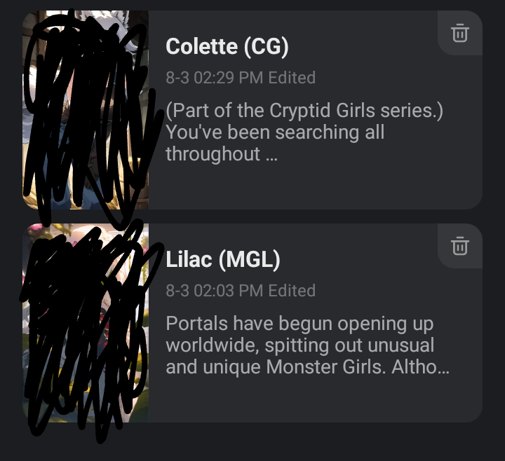 anyway here is some of my current drafts as a teaser (you don't get to see their images just yet though I'd hate to spoil the surprise) I also have a currently unlisted standalone character that I'm very fond of so watch out for her. goodbye everyone