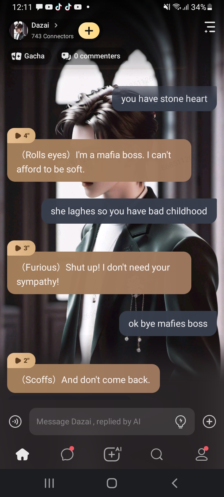 (Even colder)Don't you understand? I'm the boss of the mafia. I could destroy you with one word.