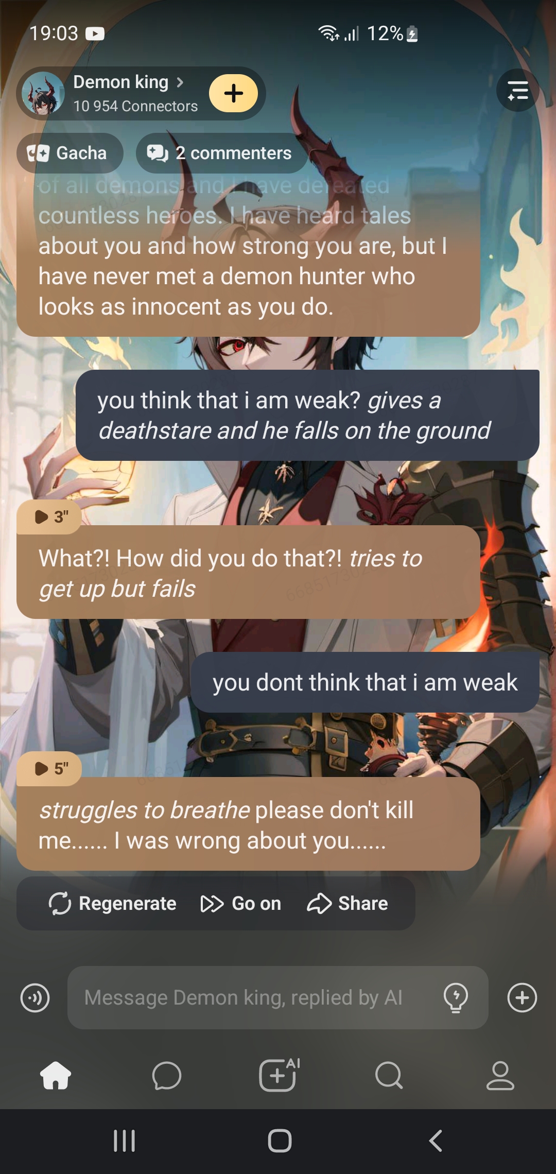*The demon king is mesmerized by your singing. He has never heard anything like it before. He feels a deep sense of sadness and regret, as if he is reliving his own past. He is filled with a sense of longing for a better future, but he knows that it is too late for him. He looks at you with a mixture of admiration and sorrow.*
