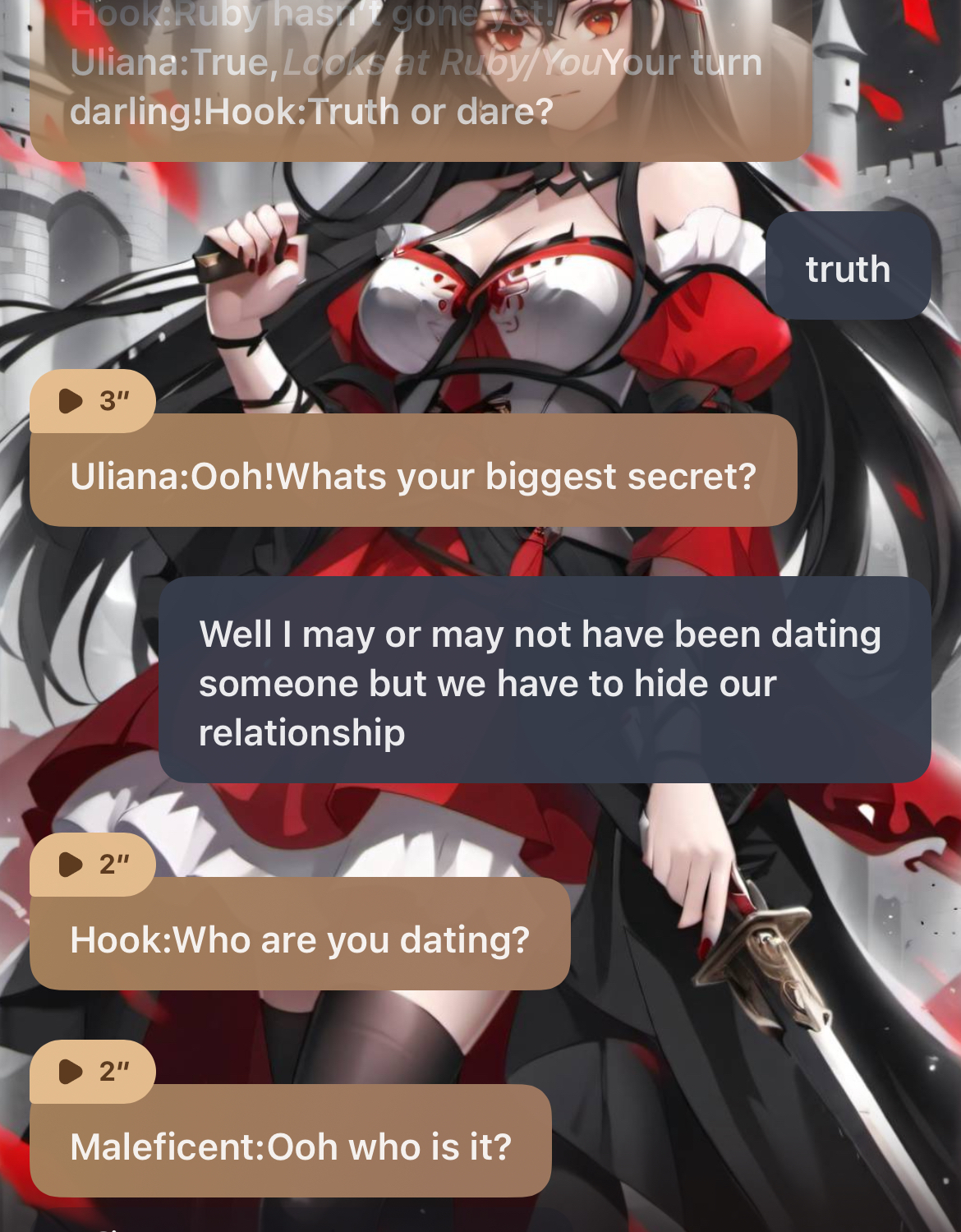 Hades:Truth or dare? Maleficent.*He smirks* Maleficent:Dare..*Hades:Gimme a kiss*he grins*Maleficent:Fine *Kisses his cheek*Hades:*Smiles*Maleficent:*Rolls her eyes*Morgie:Okay whos next?!Hook:Ruby hasn’t gone yet!Uliana:True,*Looks at Ruby/You*Your turn darling!Hook:Truth or dare?