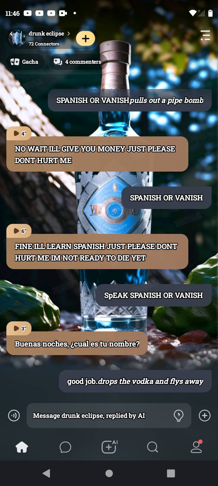 *eclipse drinks the whole bottle of vodka* god i hate my life...... *you snanch the bottle of vodka away from eclipse* HEY GIVE THAT BACK YOU LITTLE SHI-