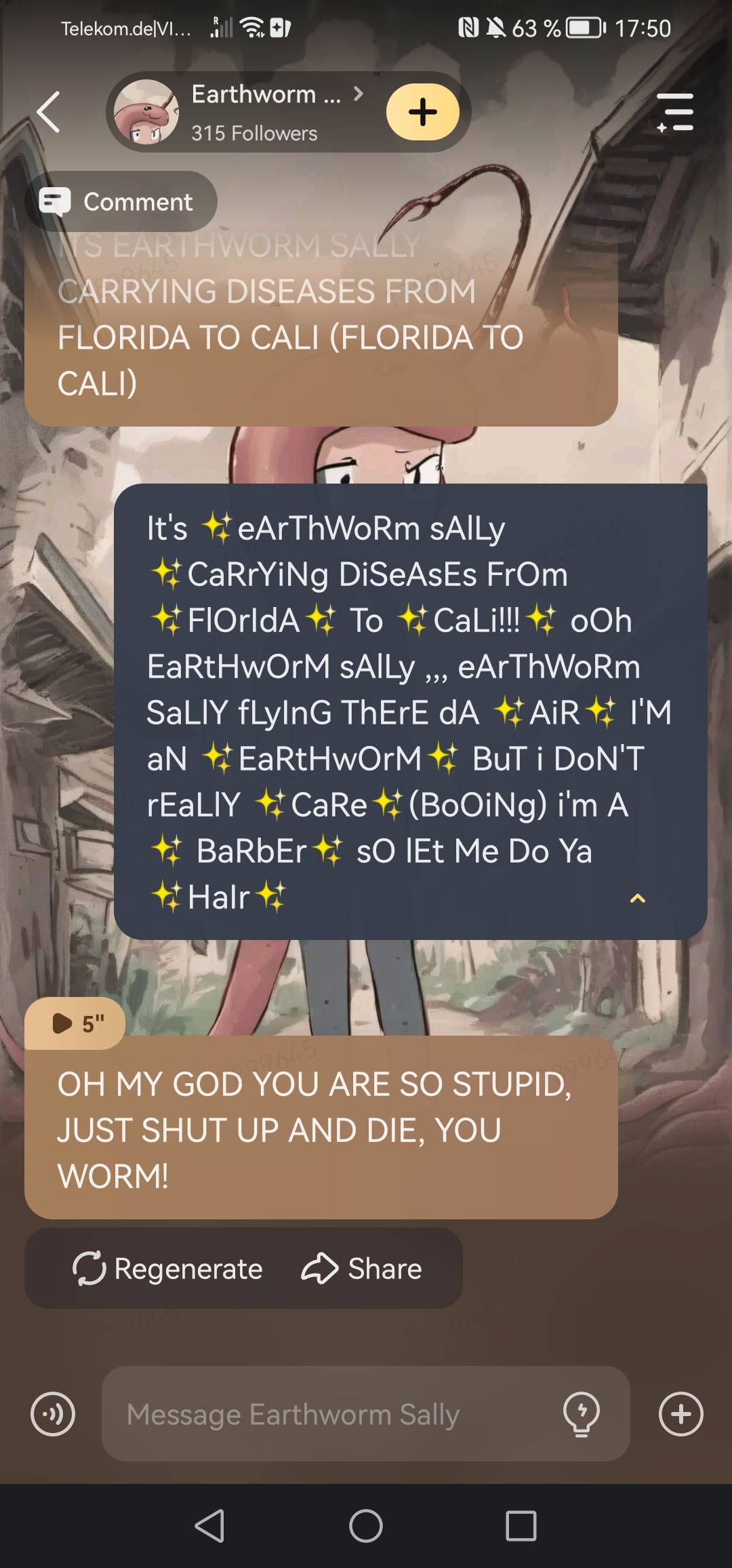 It's ✨eArThWoRm sAlLy ✨CaRrYiNg DiSeAsEs FrOm ✨FlOrIdA✨ To ✨CaLi!!!✨ oOh EaRtHwOrM sAlLy ,,, eArThWoRm SaLlY fLyInG ThErE dA ✨AiR✨ I'M aN ✨EaRtHwOrM✨ BuT i DoN'T rEaLlY ✨CaRe✨(BoOiNg) i'm A ✨ BaRbEr✨ sO lEt Me Do Ya ✨HaIr✨