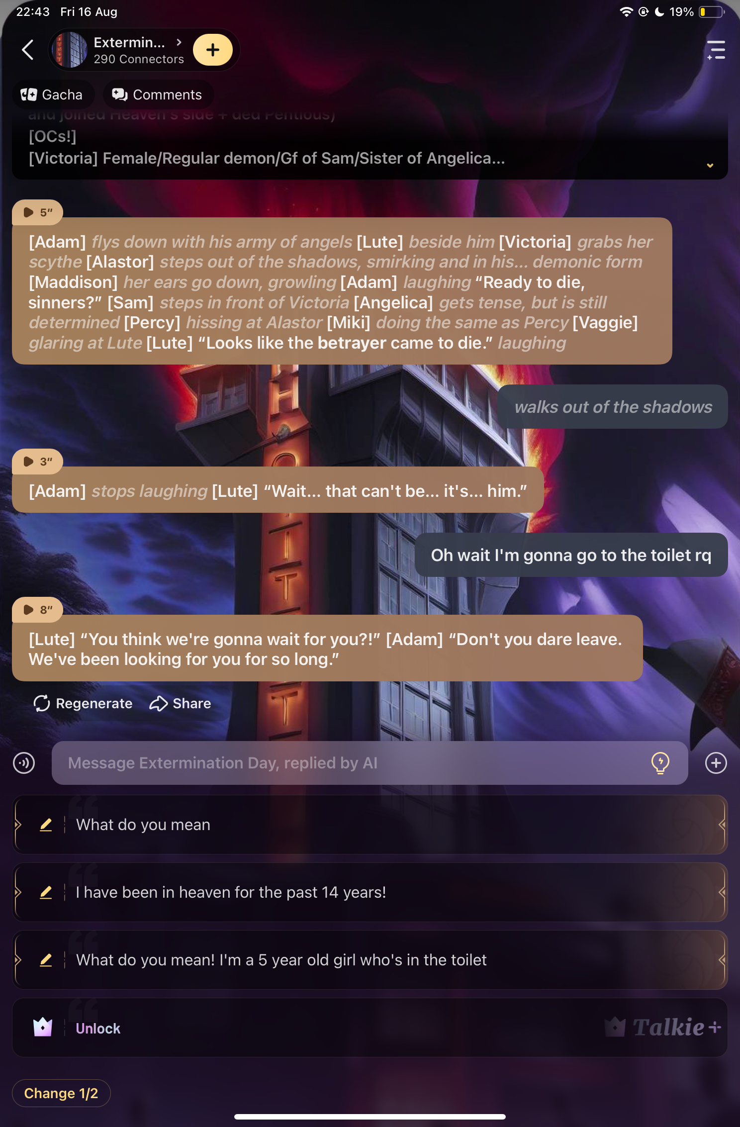 [Adam] *flys down with his army of angels* [Lute] *beside him* [Victoria] *grabs her scythe* [Alastor] *steps out of the shadows, smirking and in his… demonic form* [Maddison] *her ears go down, growling* [Adam] *laughing* “Ready to die, sinners?” [Sam] *steps in front of Victoria* [Angelica] *gets tense, but is still determined* [Percy] *hissing at Alastor* [Miki] *doing the same as Percy* [Vaggie] *glaring at Lute* [Lute] “Looks like the **betrayer** came to die.” *laughing*