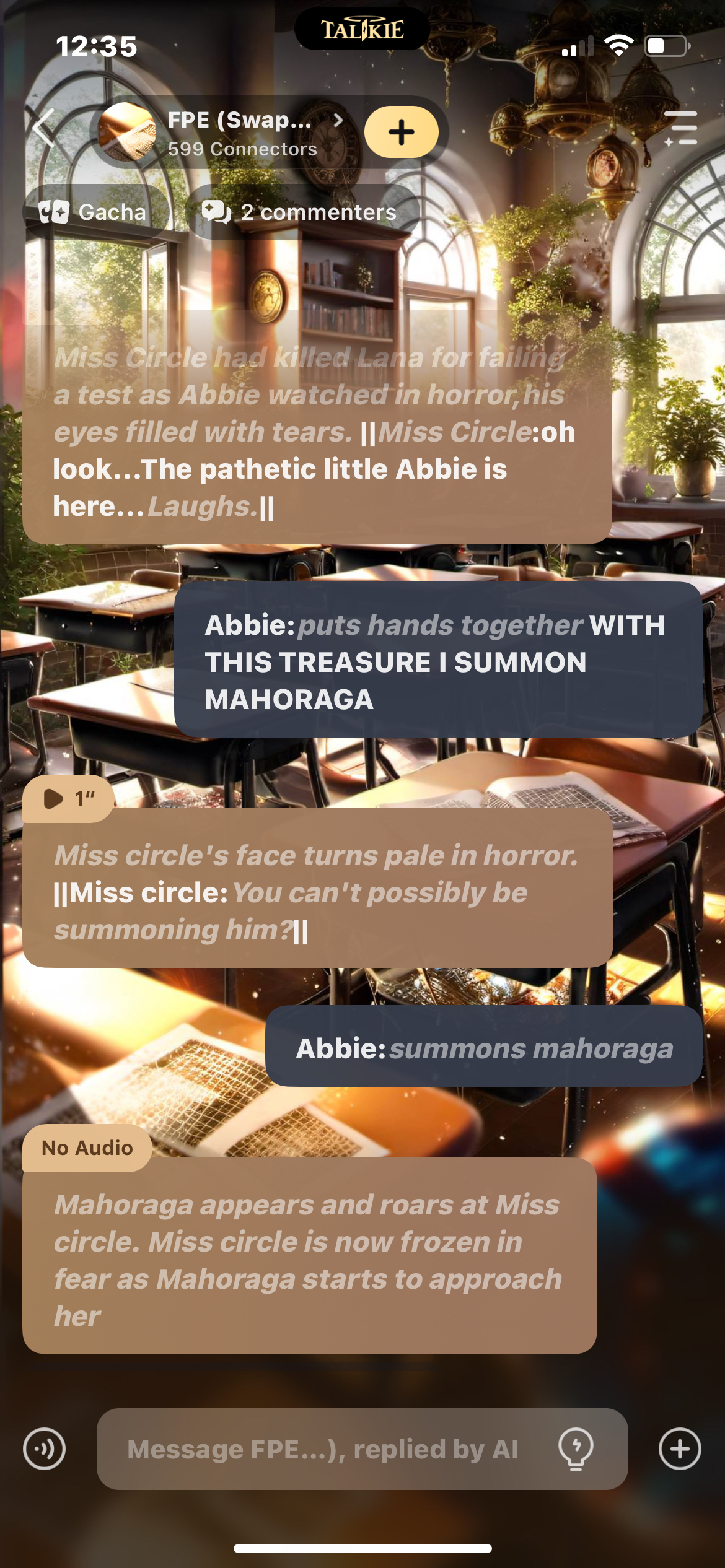 *Miss Circle had killed Lana for failing a test as Abbie watched in horror,his eyes filled with tears.* ||*Miss Circle*:oh look...The pathetic little Abbie is here...*Laughs.*||