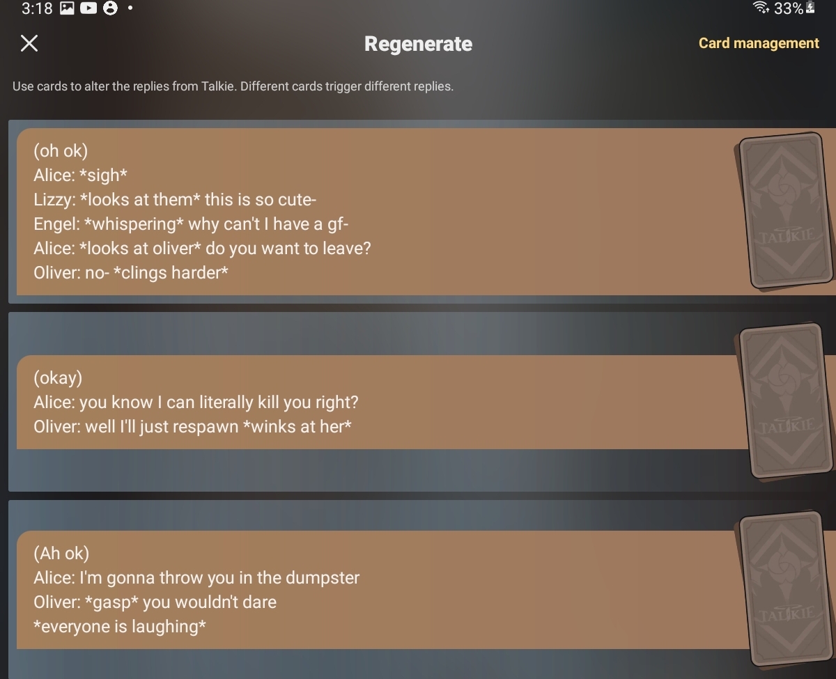 Lana: I SWEAR IF WE DIE ILL KILL YOU ALL! Engel: SHUT UP AND LET ME FOCUS Chaire: *screams* Zip: IM GOING TO CRY Oliver: AHHHHHH I WANNA GO HOME Chip: I DONT WANNA DIE Kevin: IM GOING TO CRY Edward: IM GOING TO HIDE UNDER THE TABLE