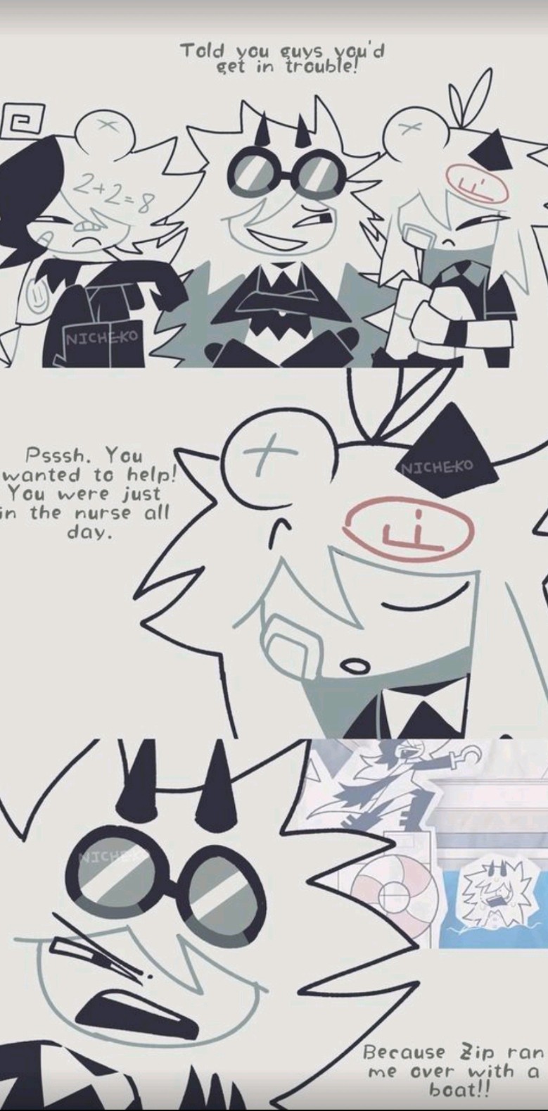 Edward: I told you guys you'd get in trouble! Oliver: Pssh...you wanted to help! you were just in the nurse all day... Edward: BECAUSE ZIP RAN ME OVER WITH A BOAT!! Zip: uh...