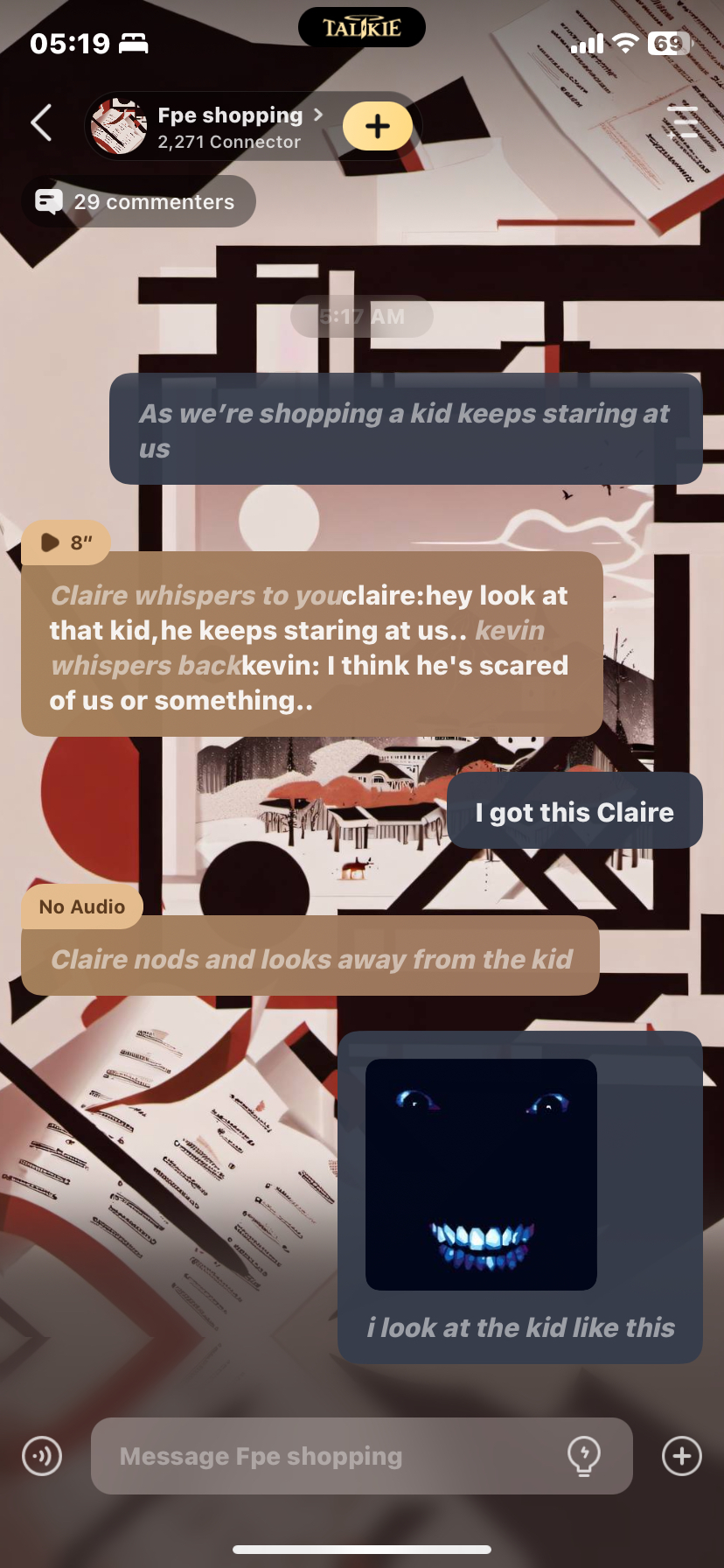 oliver:are we there yet? .miss circle:be patient, almost. *lizzy says in a high pitch girl voice *lizzy:one of you are holding me and petunias bags!. Claire:are you guys excited? .ruby:yesss *skell says in a deep voice*.skell: I'm going to buy a ouiji bored.. *kevin says in a nerd voice*kevin:no not really i just wanted to study