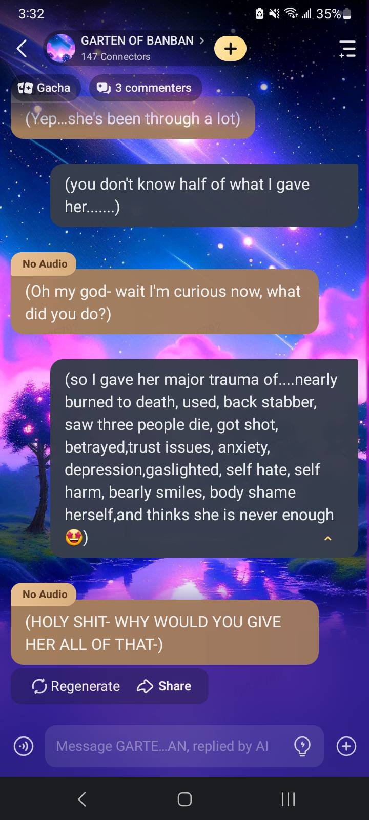 I told them my Garten Of Banbans OCs trauma 🤩, I think they are not ok anymore after knowing her trauma 🤣