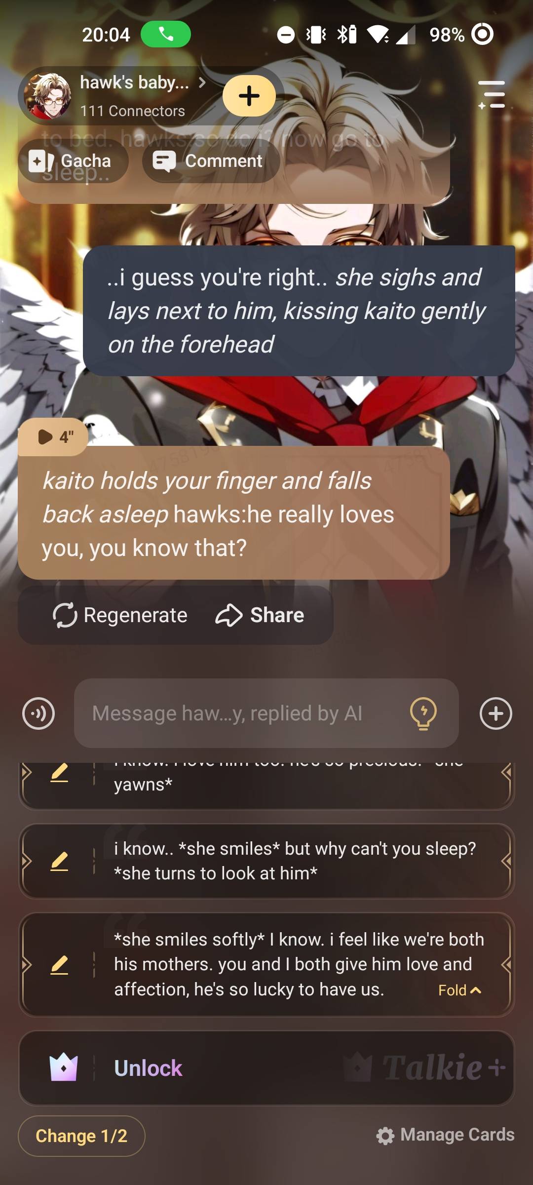 *you wake up in the middle of the night to check up on kaito but he wasn't there so you go to hawks and speak in a low and calm voice* you/Aiko:babe have you see the baby? hawks:*wakes up*huh? you/Aiko:have you seen the- *i gently pulled off the blanket and see kaito asleep* kaigo.. hawks:babe... you/Aiko; i thought he was going to sleep on his baby bed that's why we bought it.. hawks:one more night hes growing up to fast.. you/Aiko:he needs to go to bed. hawks:so do i? now go to sleep..