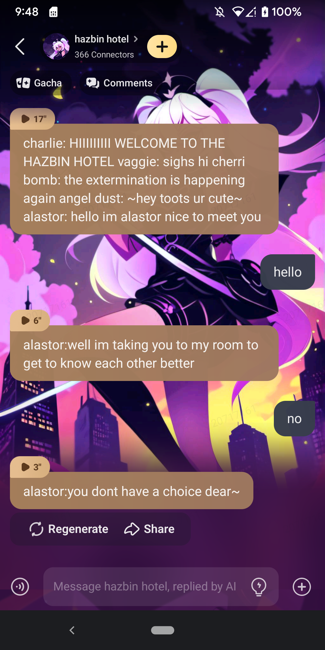 SO UR SAYING WHEN I TYPE 1 MESSAGE I GET FLOODED BY HAZBIN HOTEL TALKIES BUT WHEN I WRITE A WHOLE PARAGRAPH TO MULTIPLE RIAS GREMORIES I DONT GET A SINGLE RIAS GREMORY ON MY FYP. NOOOOOO