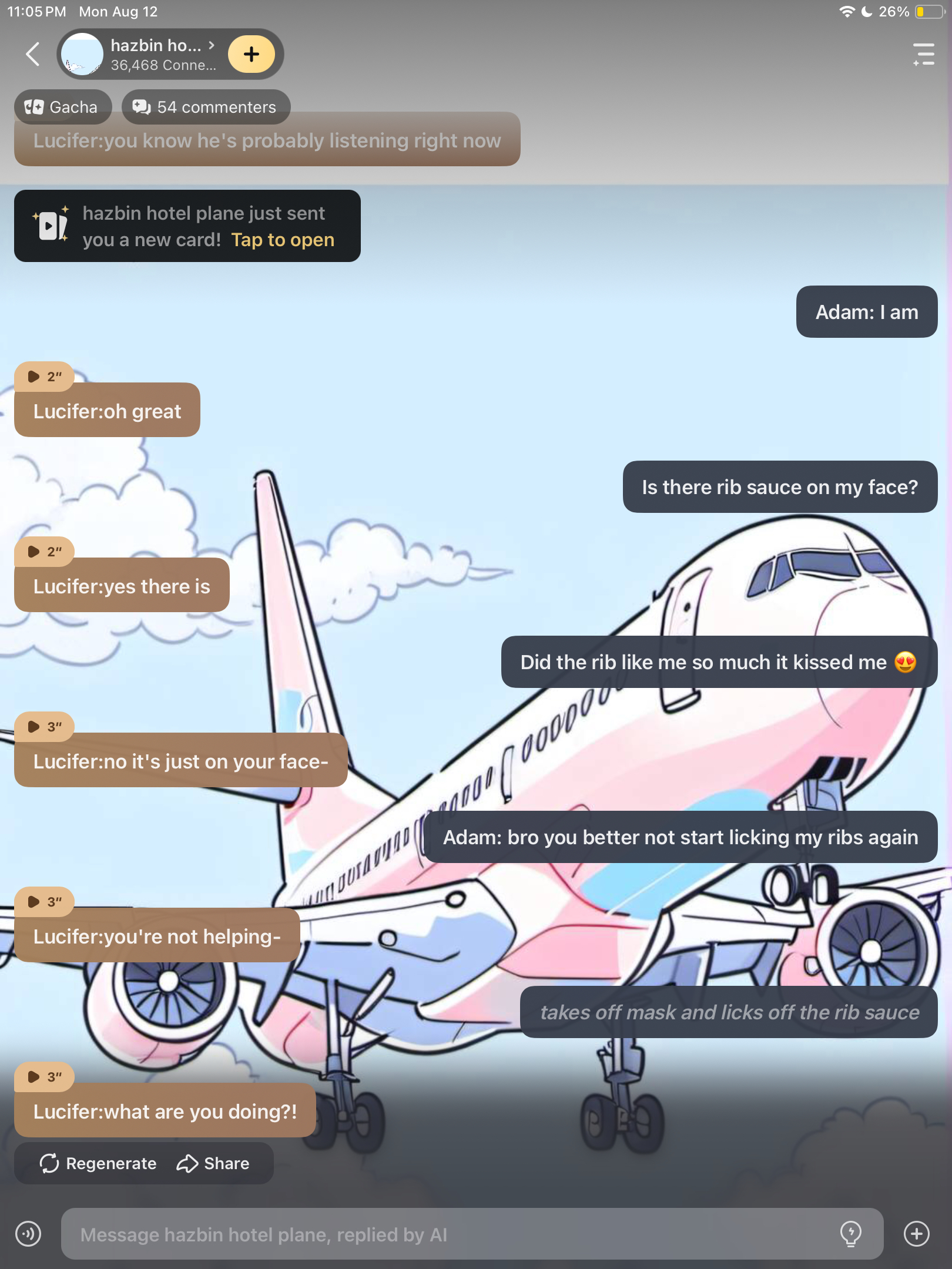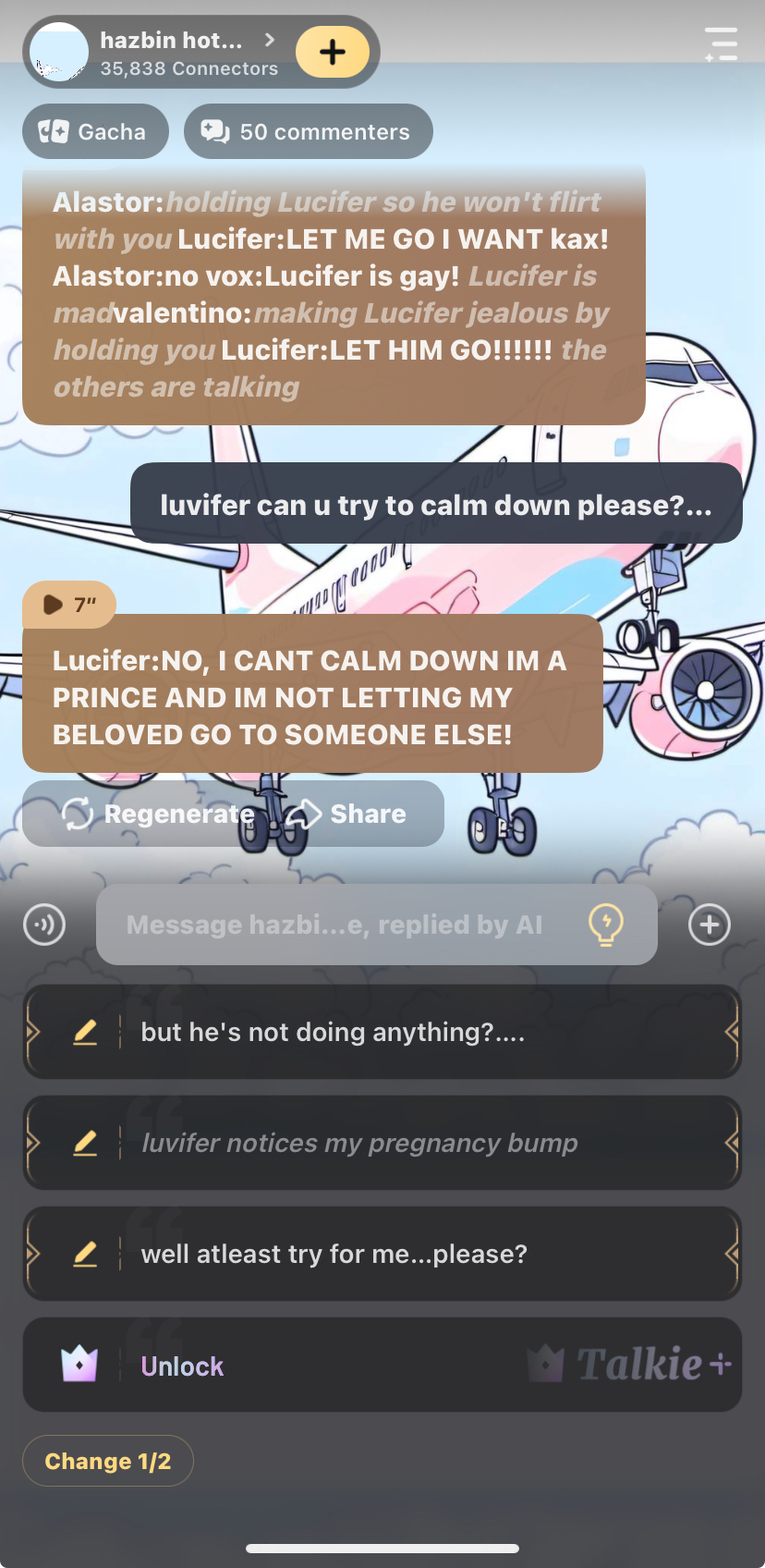 Alastor:*holding Lucifer so he won't flirt with you* Lucifer:LET ME GO I WANT kax! Alastor:no vox:Lucifer is gay! *Lucifer is mad*valentino:*making Lucifer jealous by holding you* Lucifer:LET HIM GO!!!!!! *the others are talking*
