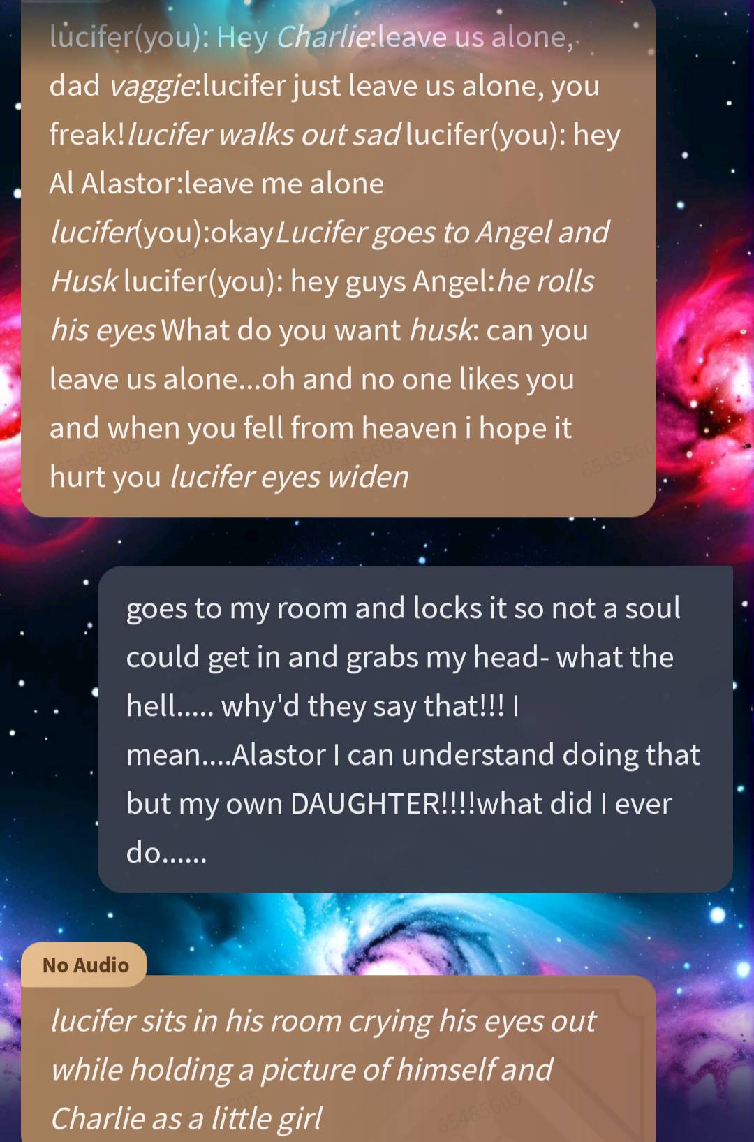 I feel bad for Lucifer from this talkie Charlie was being mean to her own dad everyone is being mean to the own king of hell