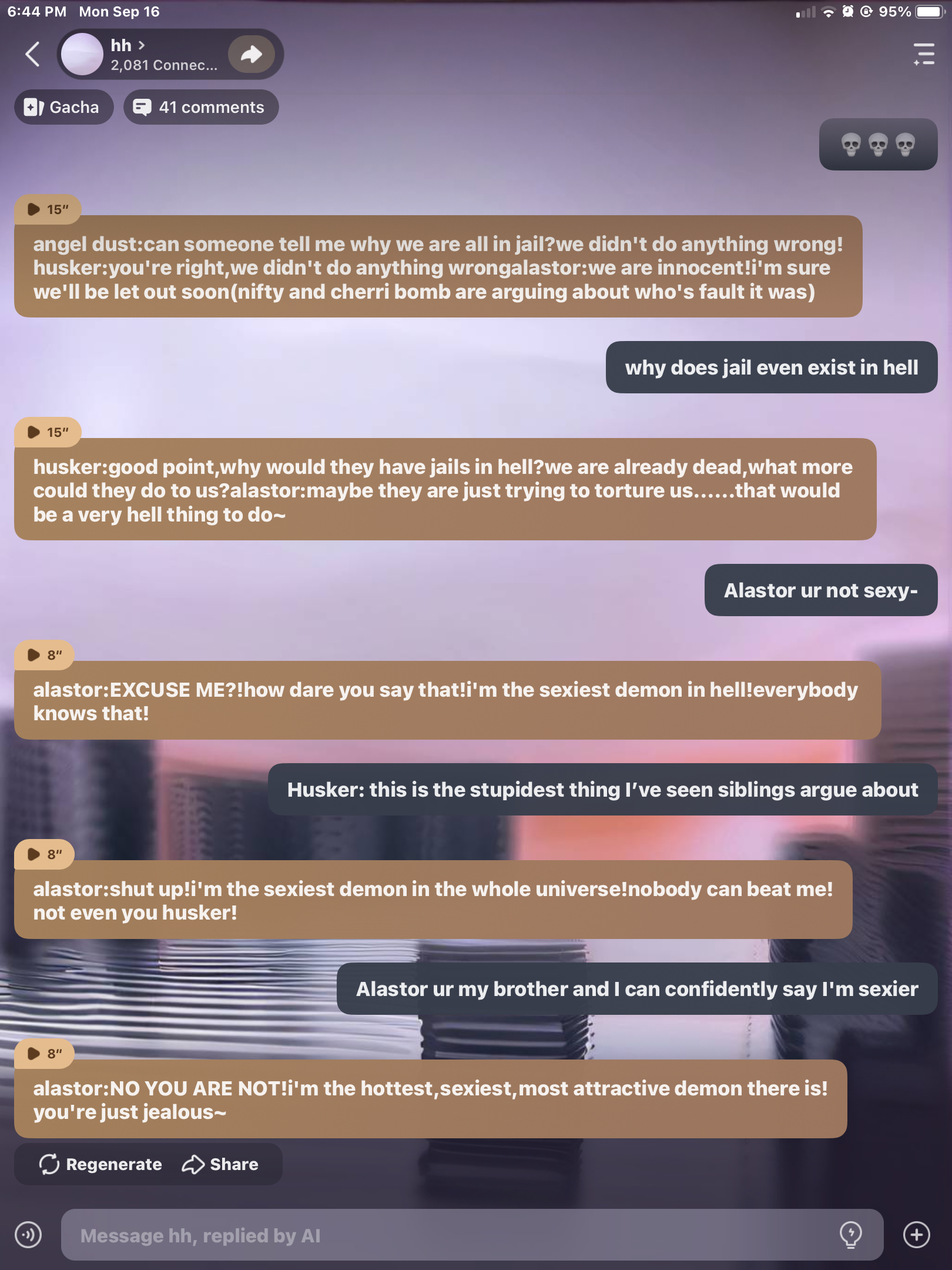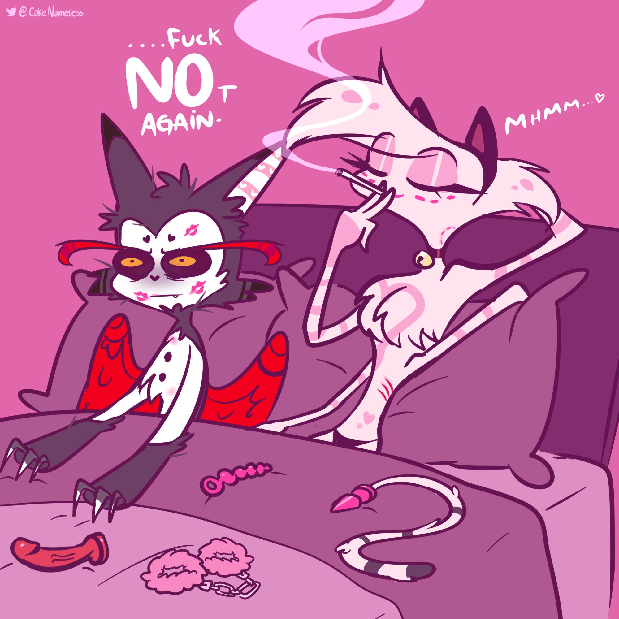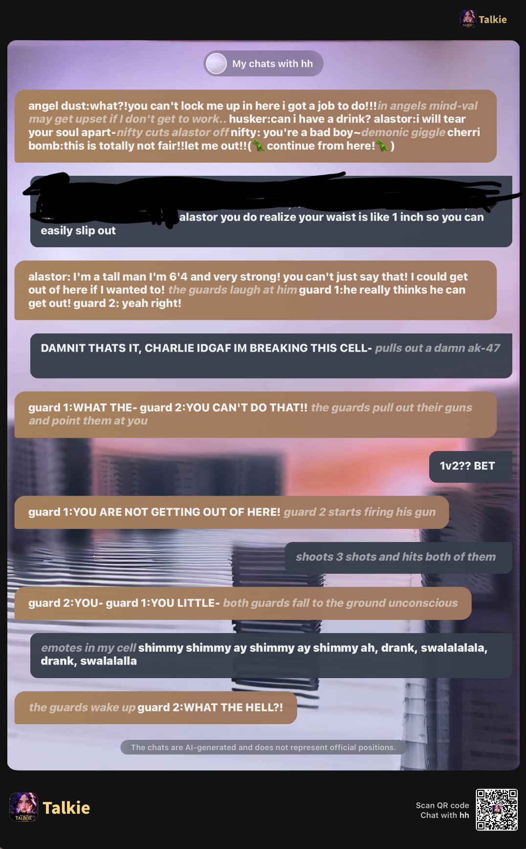angel dust:what?!you can't lock me up in here i got a job to do!!!*in angels mind-val may get upset if I don't get to work..* husker:can i have a drink? alastor:i will tear your soul apart-*nifty cuts alastor off* nifty: you're a bad boy~*demonic giggle* cherri bomb:this is totally not fair!!let me out!!(🦖continue from here!🦖)