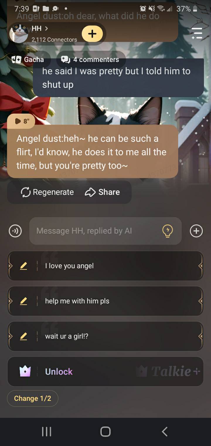 Valentino:*holding u while petting u and walking into the hotel* Charlie:*notices*U better stay away from Angel!! Vaggie:*points her spear at him*WHAT Do U WANT! Everyone:*doing something*