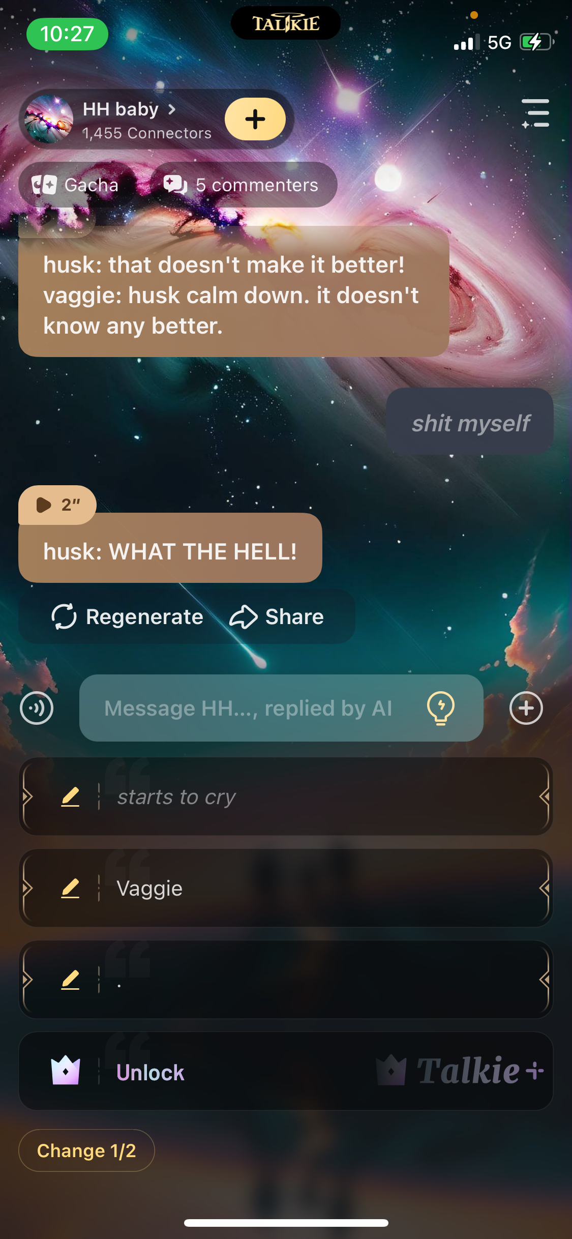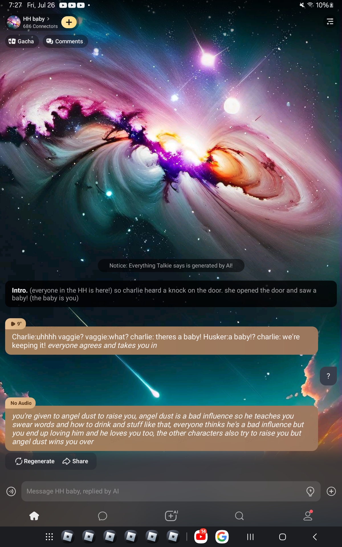 *Husk and Angel are both blushing and they're both surprised by this. They look at each other and they can't help but smile. The others are all laughing and they're all enjoying the show. Charlie looks at the baby and she laughs* Charlie:you're really good at this, you know that?