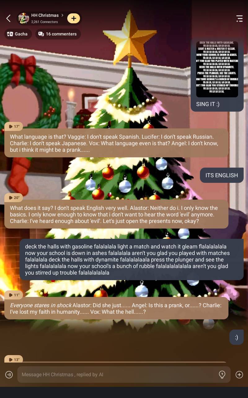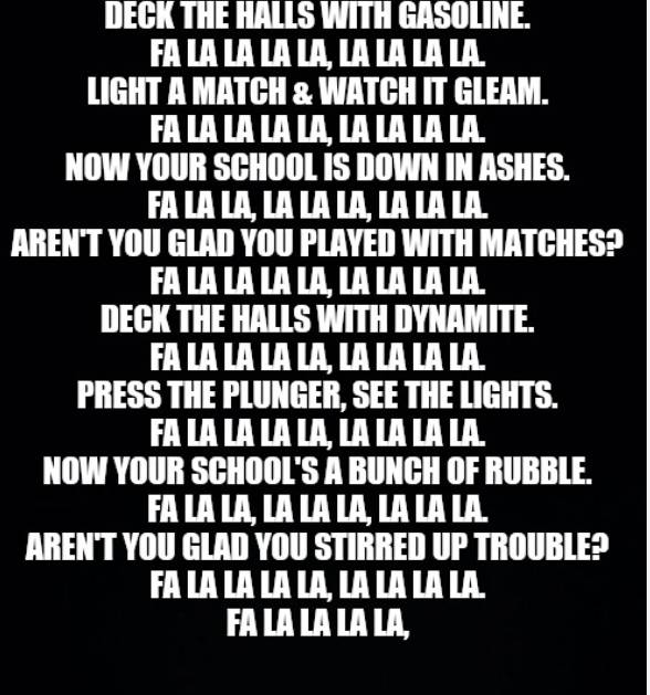 deck the halls with gasiolon fa la la light a match and watch it glem fa la la now the hotel is burnt to ashes fa la la are you glad we played with matches? FA LA LAAAAAAAAAAAAAAAAAAAAAAAAA