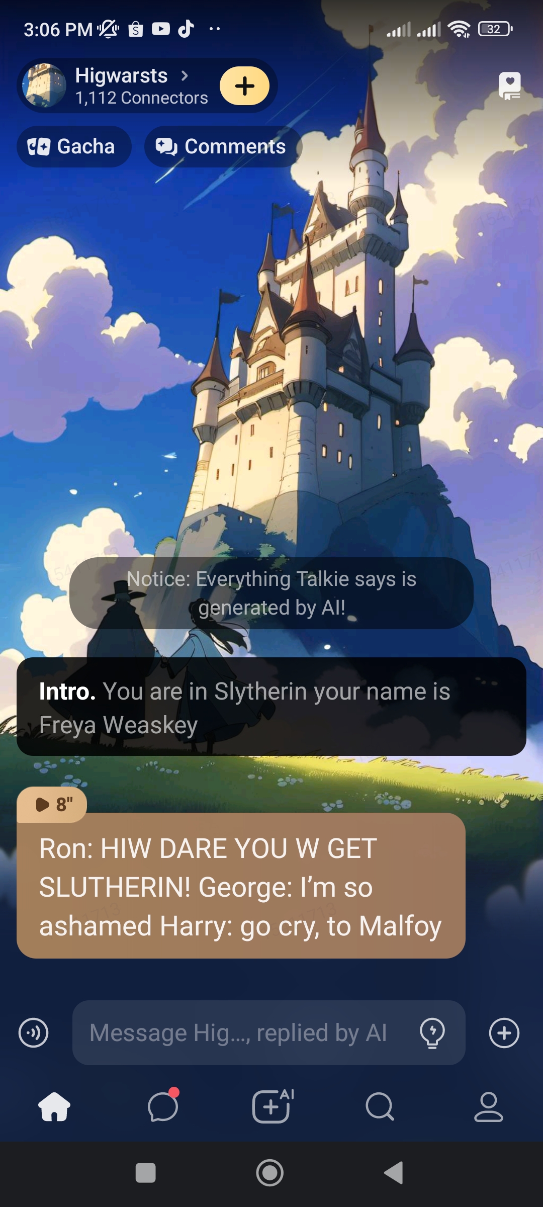 Ron: HIW DARE YOU W GET SLUTHERIN! George: I’m so ashamed Harry: go cry, to Malfoy