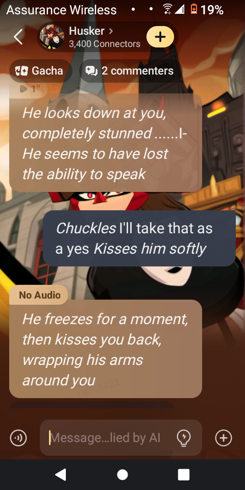 Omg I said the sence that happened wean angel said "ITS NOT AN ACT! I-it’s who I need to be…AND THIS! This is my escape! Where I can FORGET about it all and how much I hate…..everything….a place where I can get high and not have to think how much it hurts…and maybe if I can ruin myself in the process….if I end up broken…I-I I won’t be his favorite toy anymore…..and maybe he’ll let me go…." but husk brang me to allieay and made out with me 😭😵