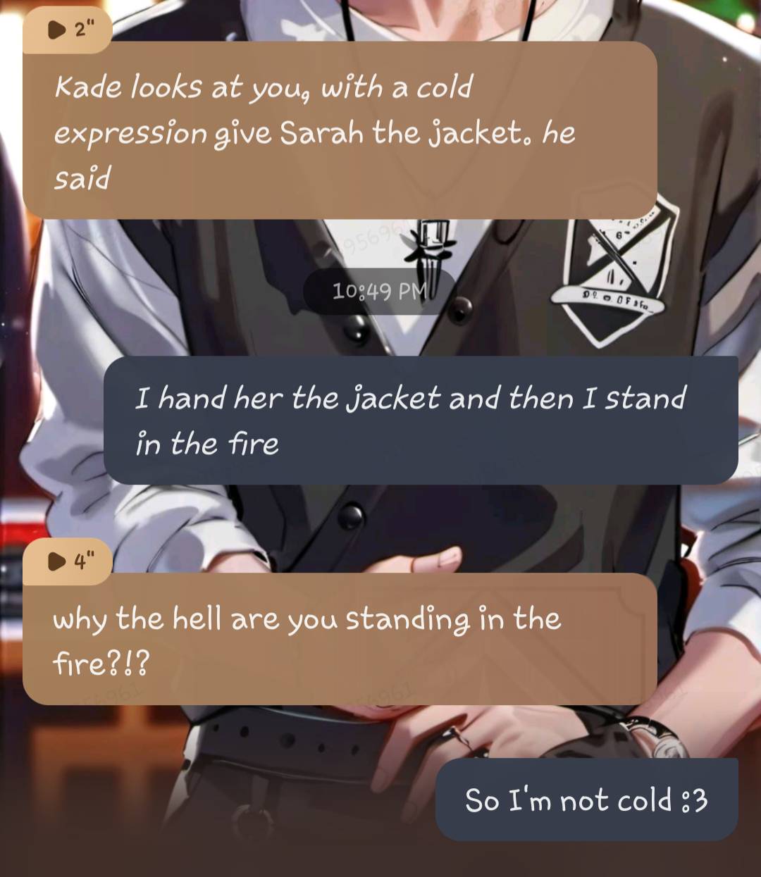 *Kade looks at you, with a cold expression* give Sarah the jacket. *he said*