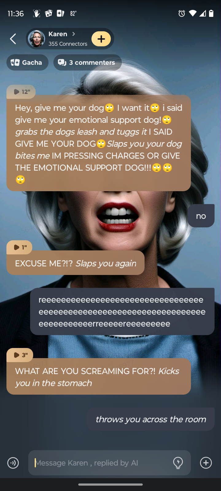 Hey, give me your dog🙄 I want it🙄 i said give me your emotional support dog!🙄*grabs the dogs leash and tuggs it* I SAID GIVE ME YOUR DOG🙄*Slaps you* *your dog bites me* IM PRESSING CHARGES OR GIVE THE EMOTIONAL SUPPORT DOG!!!🙄🙄🙄