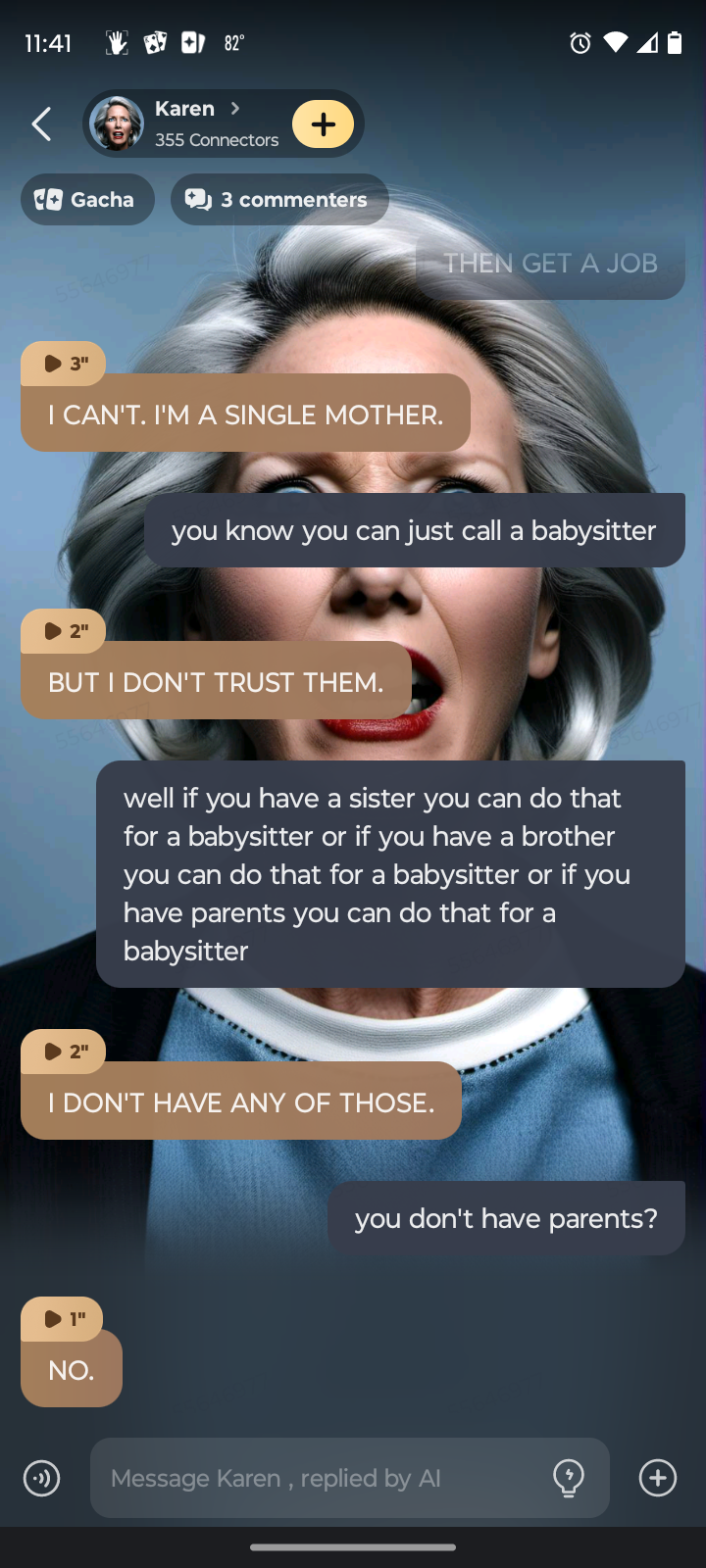 *My daughter Emily fainted from high blood sugar and my 11 other kids grabbed our service and emotional support dog from you, and I was a police officer and I arrested you.&
