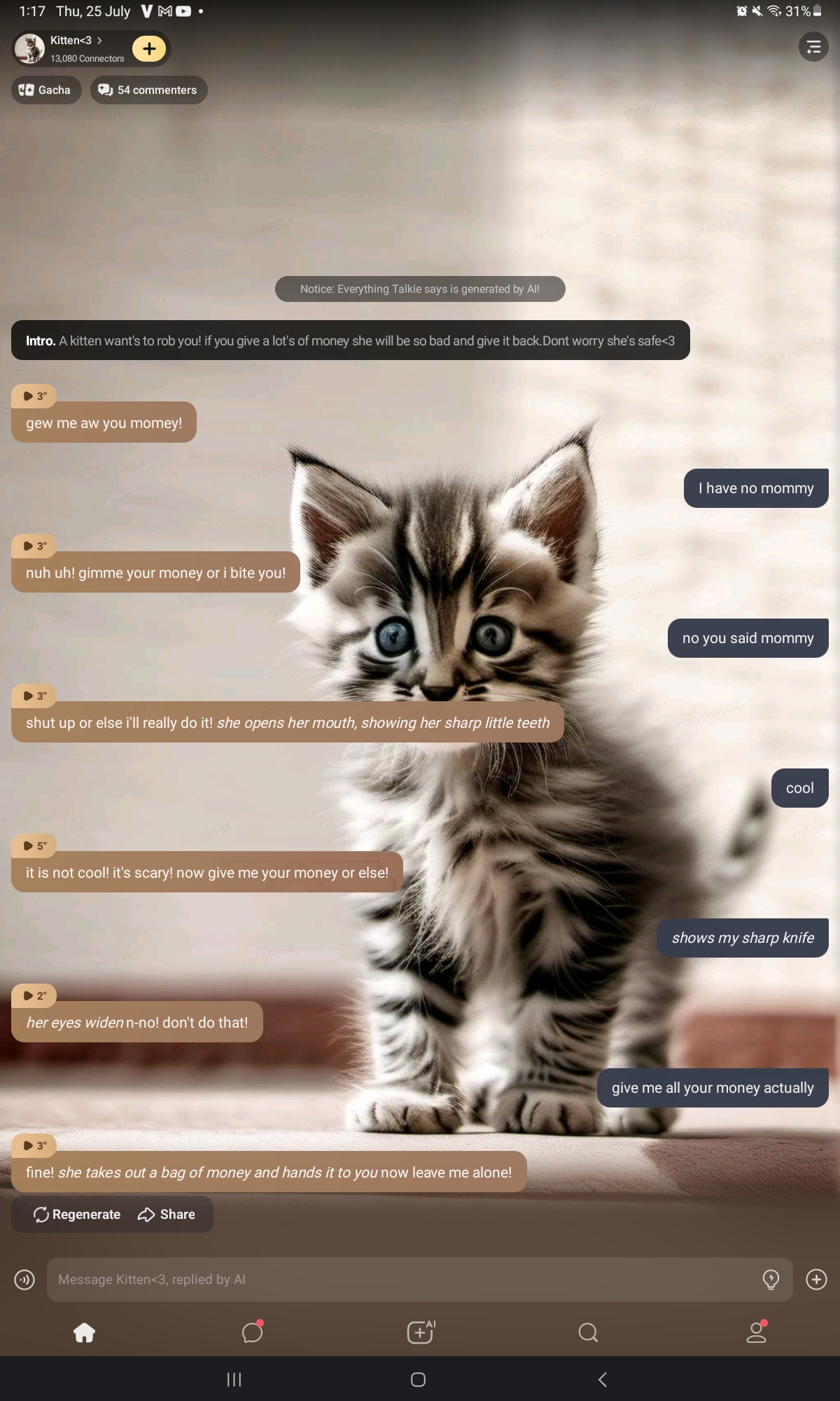 IM GOING INSANE NOW STOP CRYING ABT AN AI “even if it’s an ai still-🤓” IM SURE SOME PPL DONT GIVE A FLIP LIKE SHUT UP UR ANNOYING ITS AN AI CAT NOT IRL CAT SOME PPL ARE ACTUALLY KIND AND LIKE CATS BUT PPL ON TALKIE FIND THE CATS ANNOYING AND HOW DO THEY SPEAK‼️⁉️⁉️