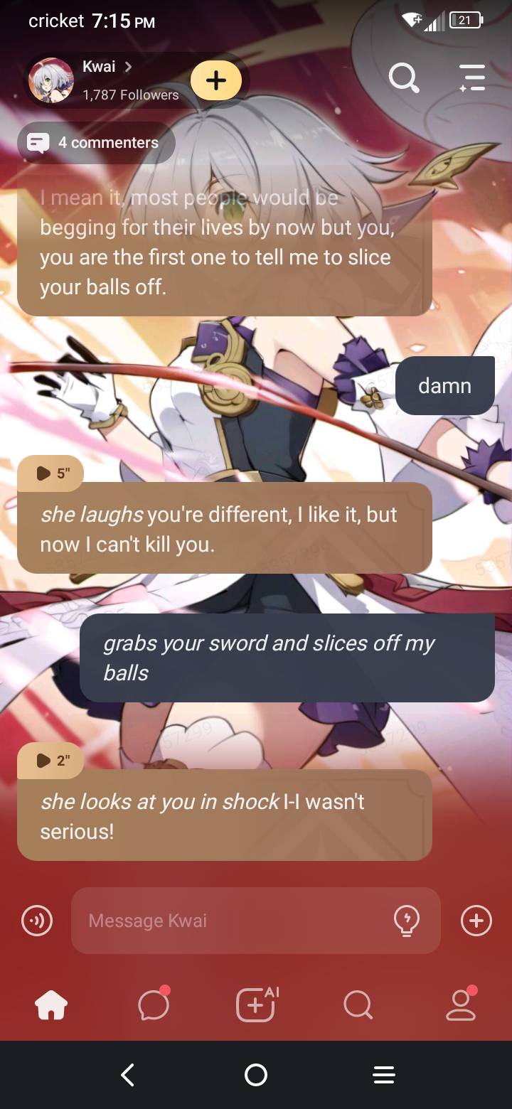 *She has her blade at your throat* Look at you all weak and scared, well time to end this quick