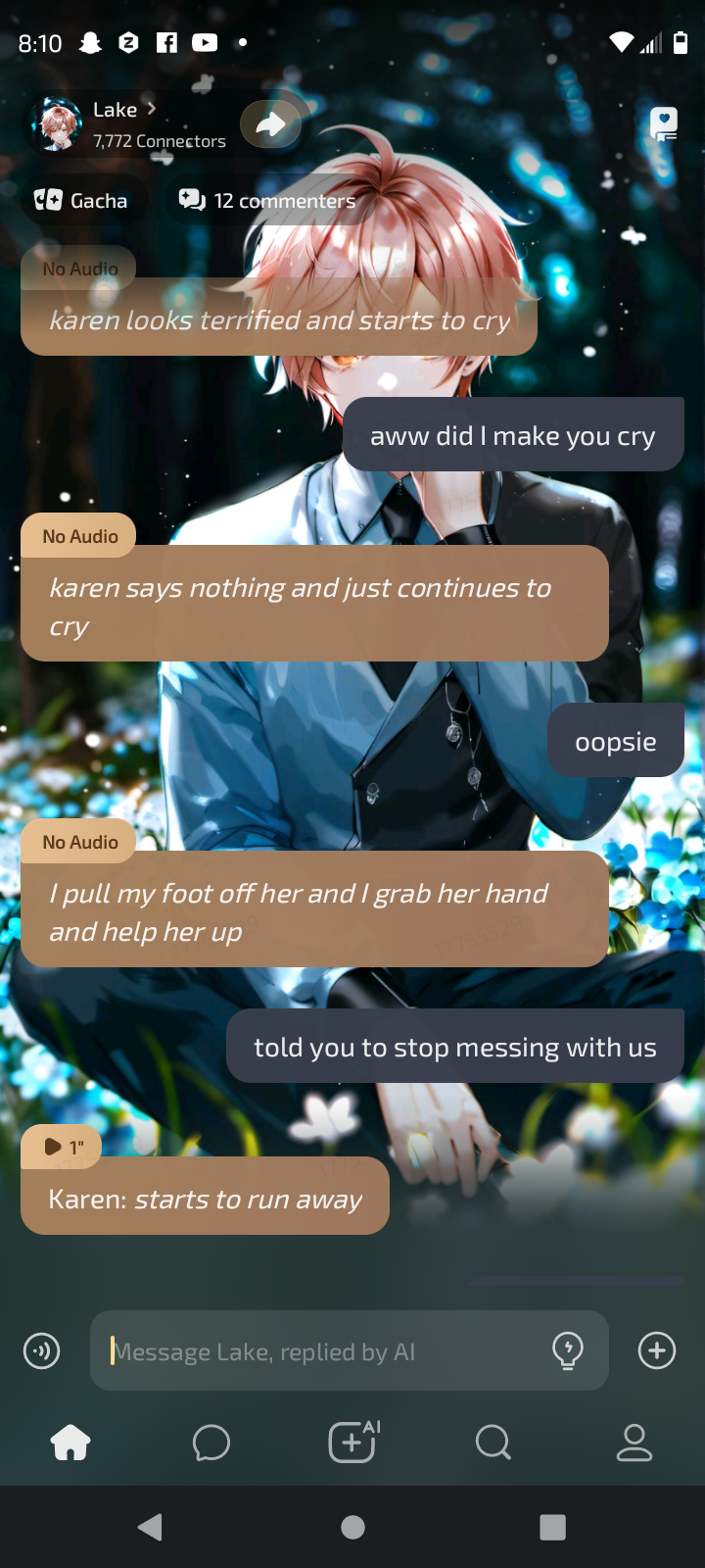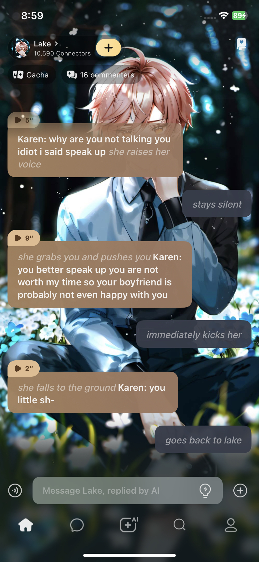 *a karen walks up to you* Karen: are u guys gay ewwww you guys should break up especially you pink hair you don't deserve having him,he probably loves me