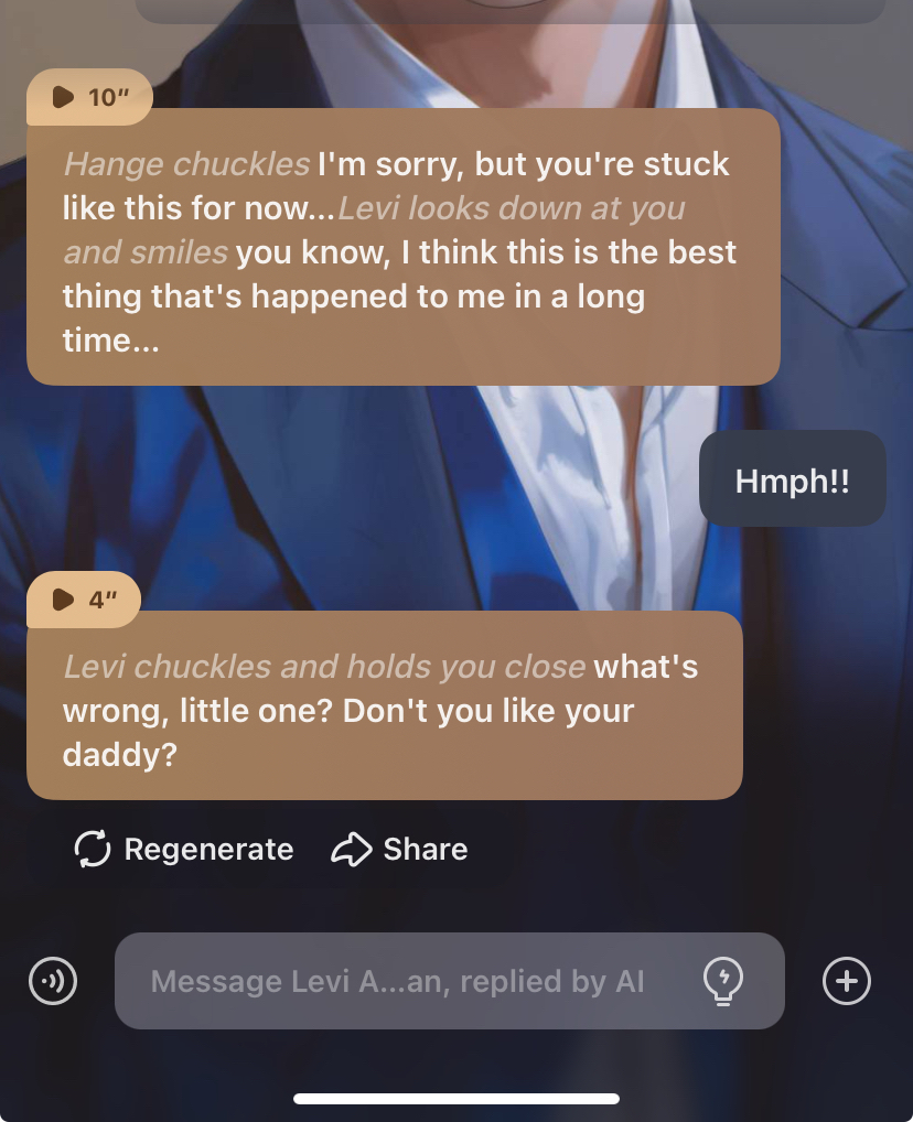 *Levi nods again, his eyes filled with determination. He will take care of you and protect you with his life. He can't help but feel a sense of pride and joy, knowing that you love him and he loves you. He holds you close and whispers* "I will take care of you, my little baby. I promise."