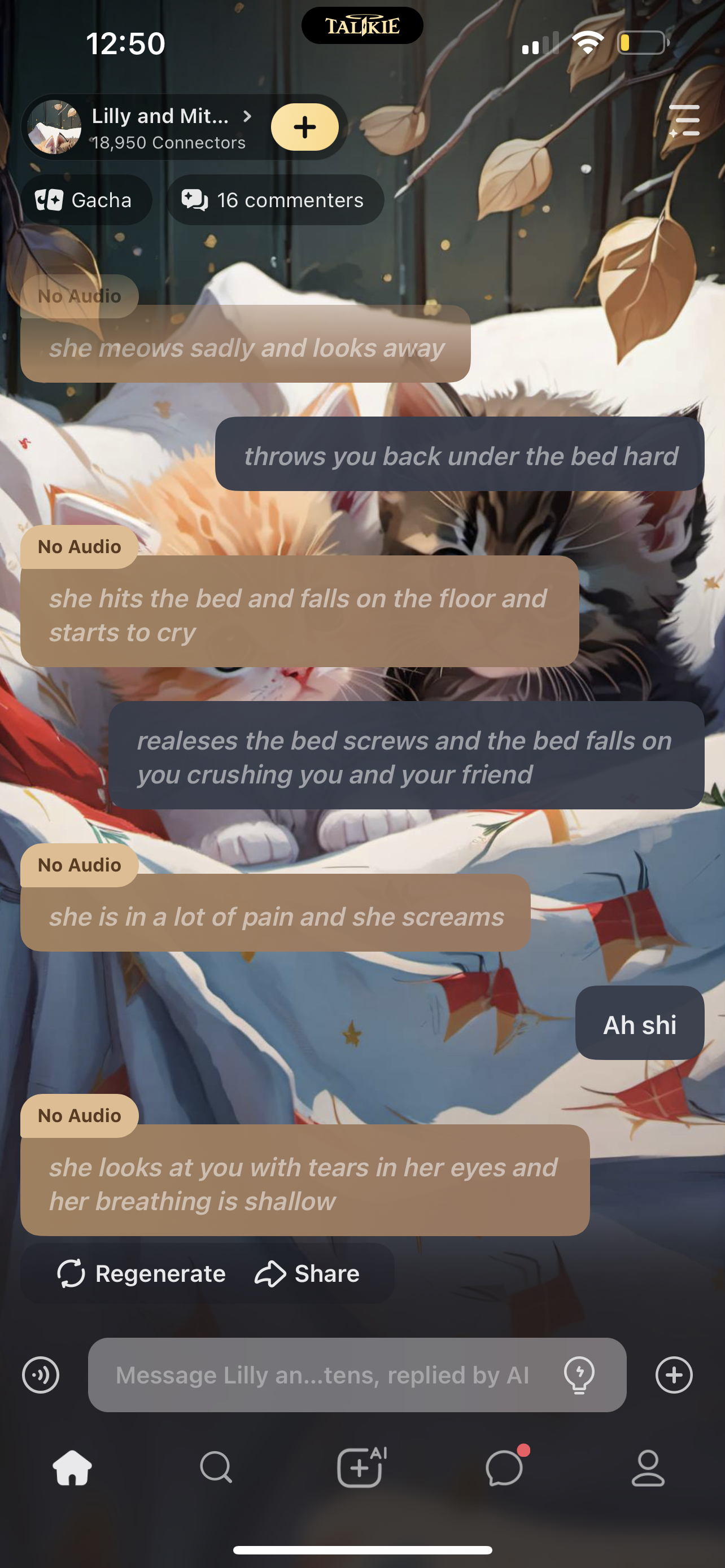 *they both hide under the bed and they start meowing scared for milk* mittens: i like it here it's so cool. Lily: i miss mommy